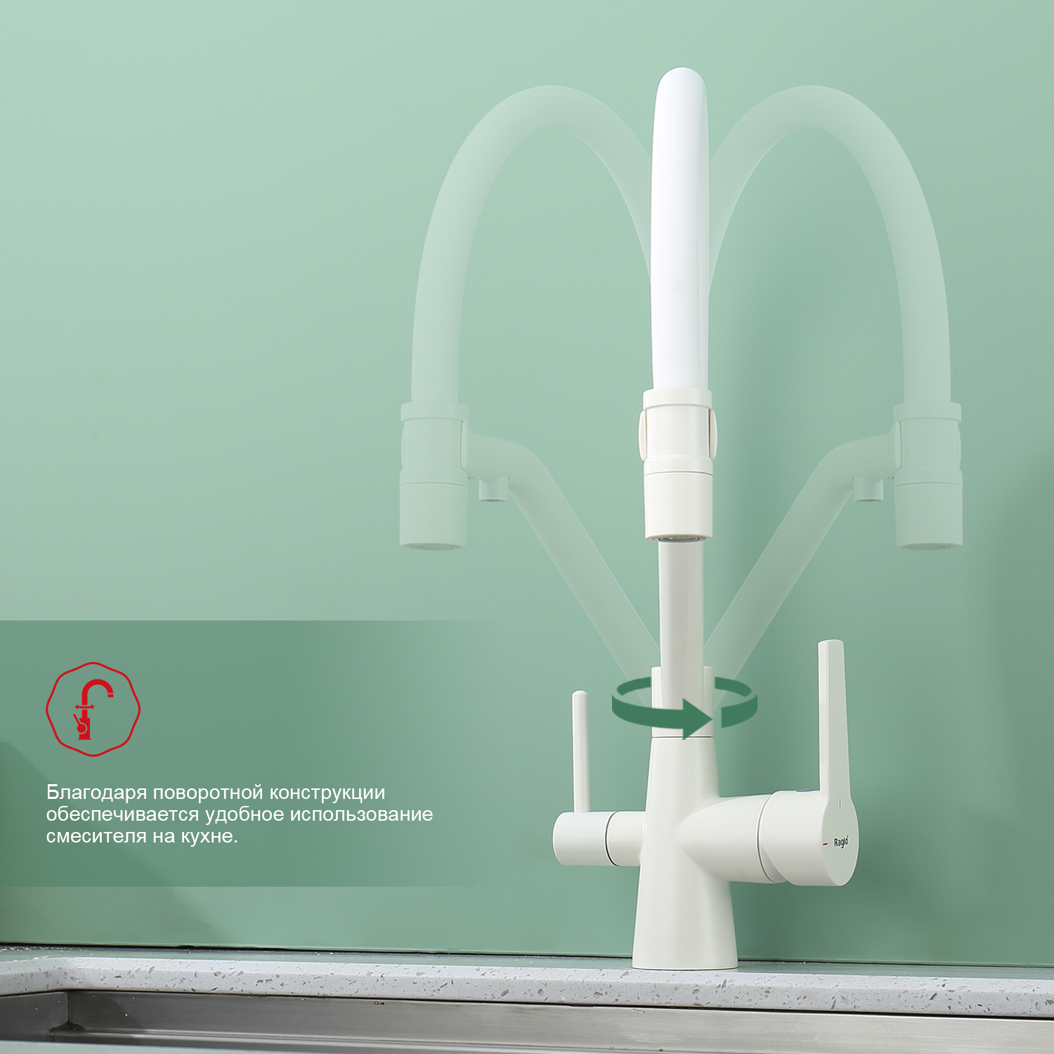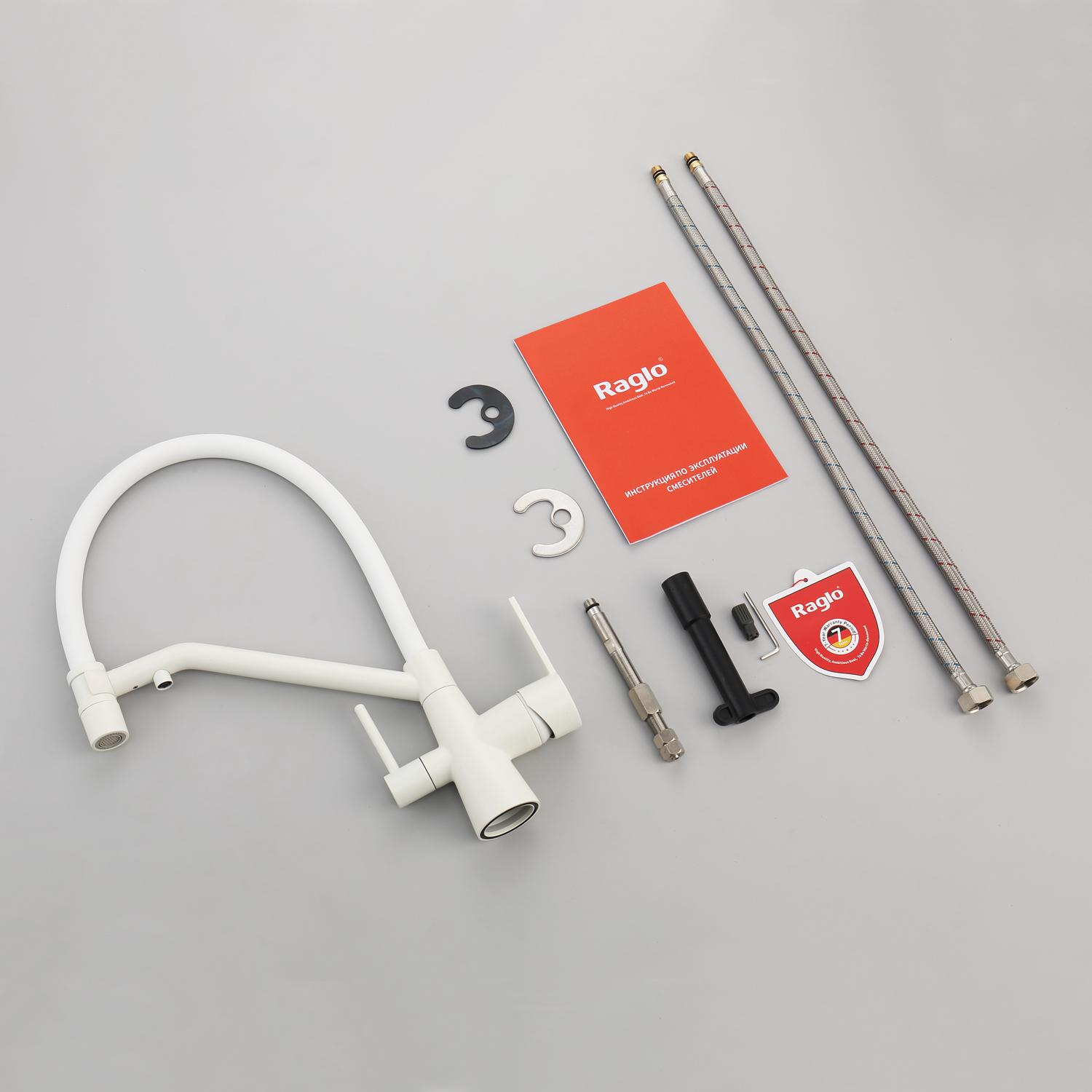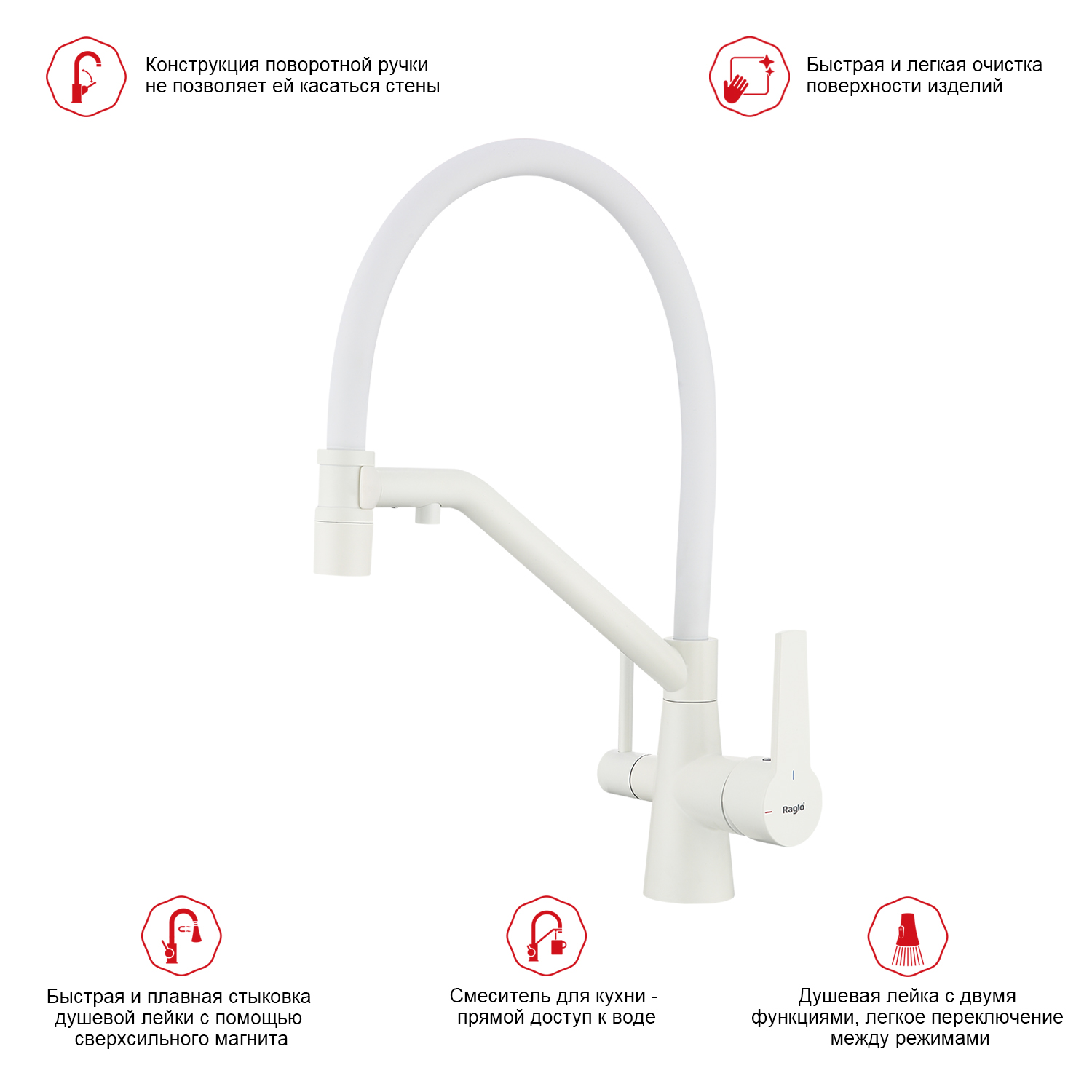 Raglo R80.62.08. Цвет: белый. Смеситель для кухни со съемным изливом на магните и подключением фильтра питьевой воды. Гибкий съемный шланг значительно расширяет зону использования смесителя, благодаря этому можно мыть объемную посуду. Модель предназначена для одновременного подключения к водопроводу и фильтру и позволяет снабжать как обычной, так и питьевой водой.