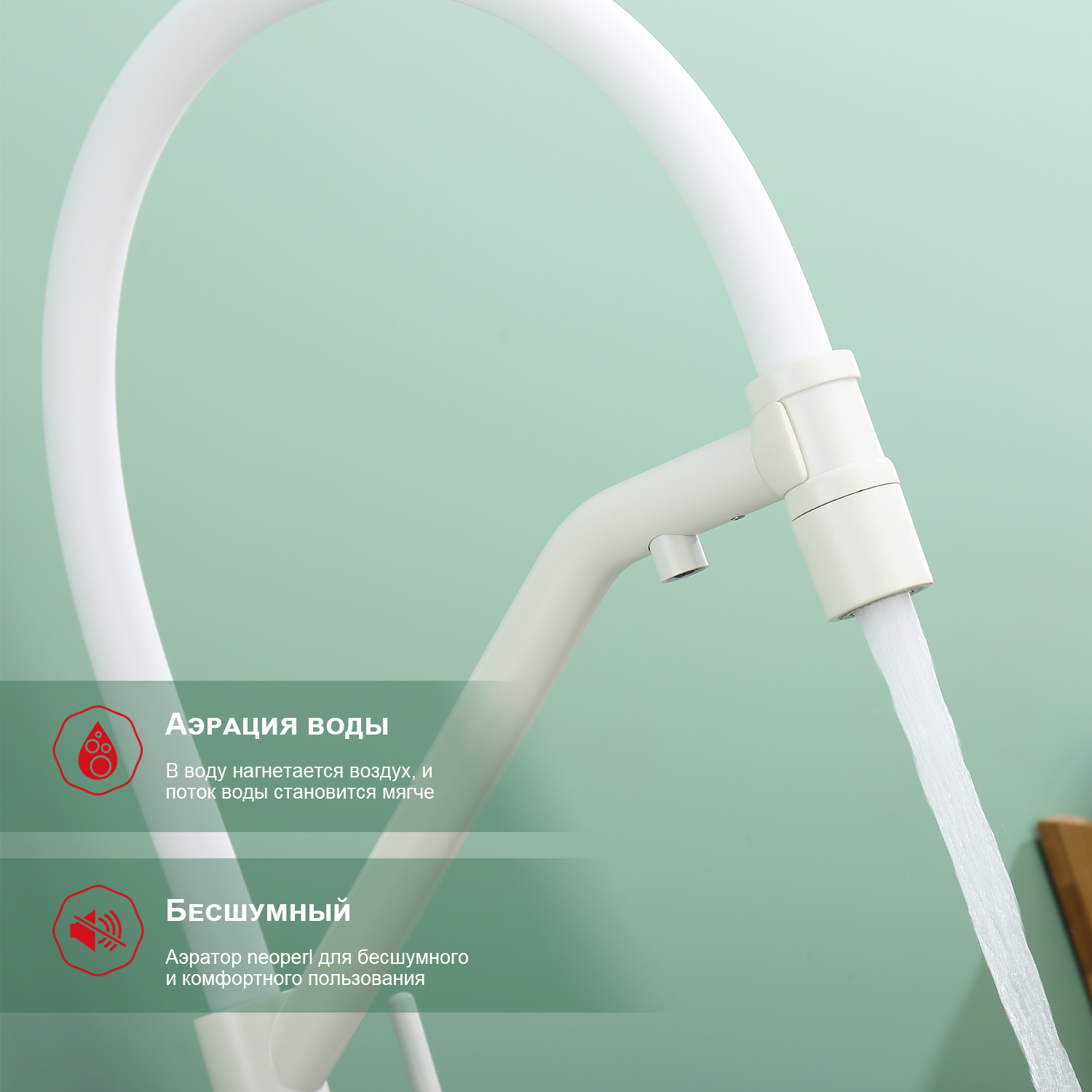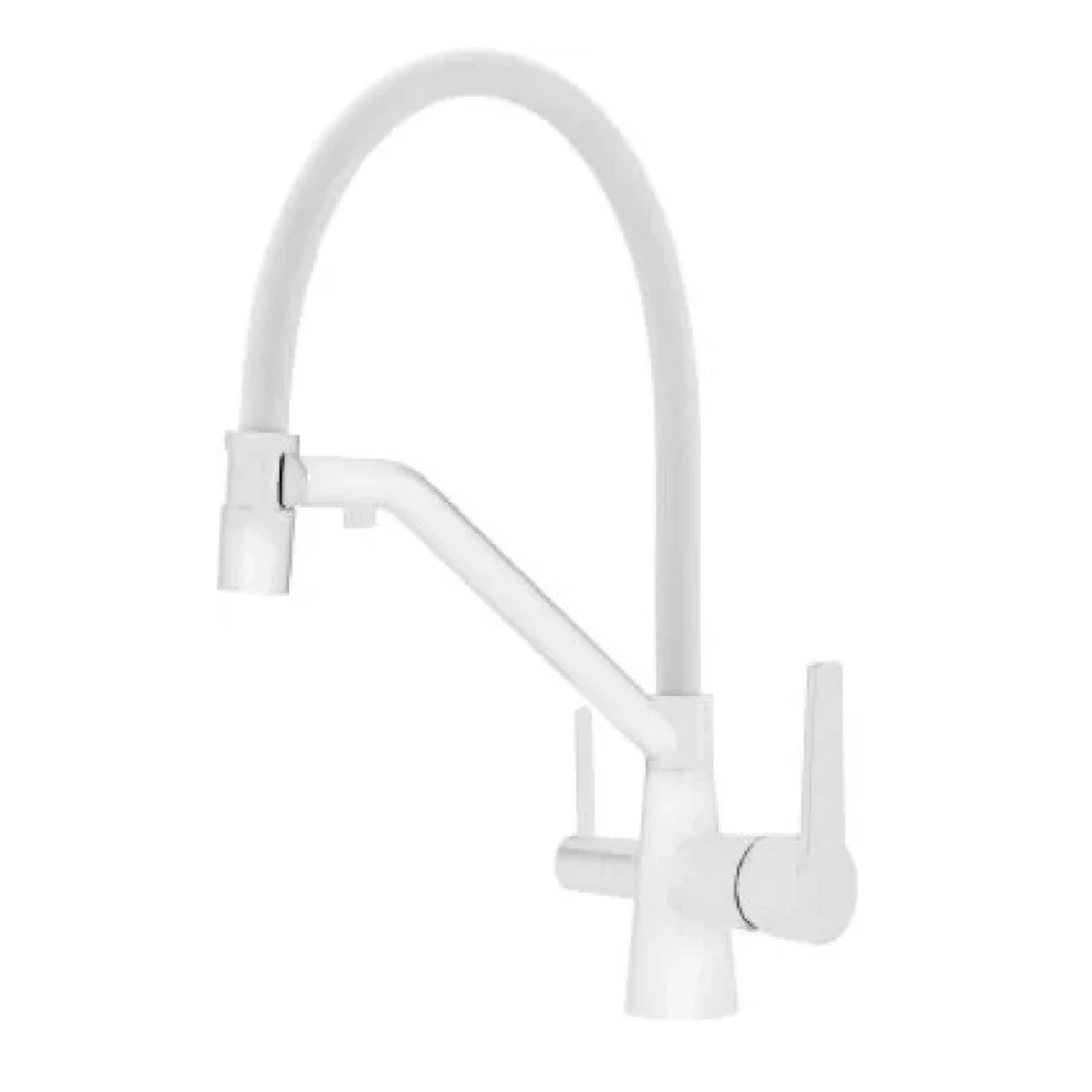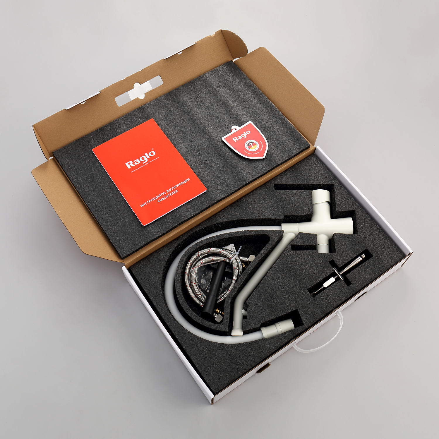 Raglo R80.62.08. Цвет: белый. Смеситель для кухни со съемным изливом на магните и подключением фильтра питьевой воды. Гибкий съемный шланг значительно расширяет зону использования смесителя, благодаря этому можно мыть объемную посуду. Модель предназначена для одновременного подключения к водопроводу и фильтру и позволяет снабжать как обычной, так и питьевой водой.