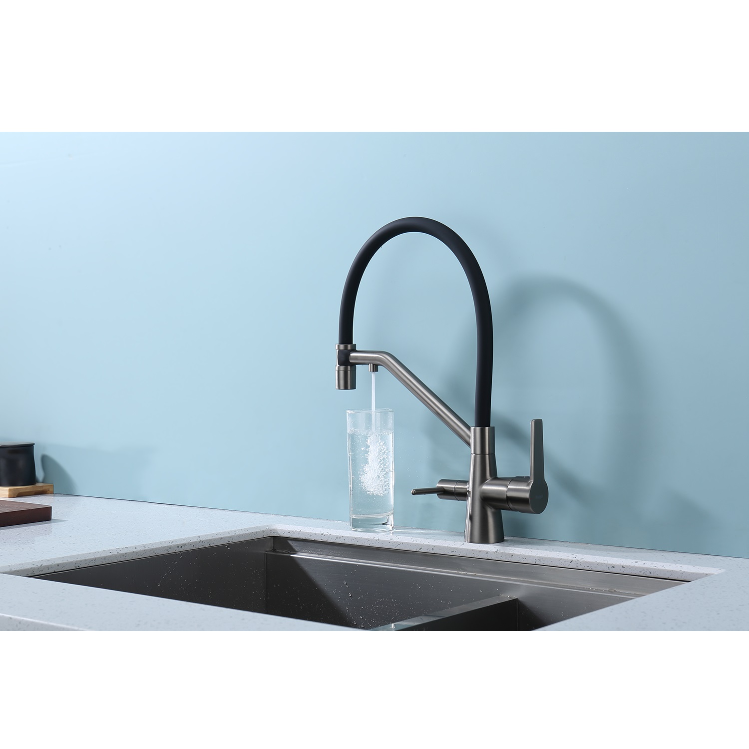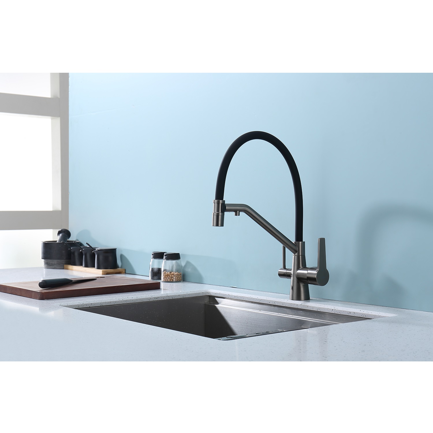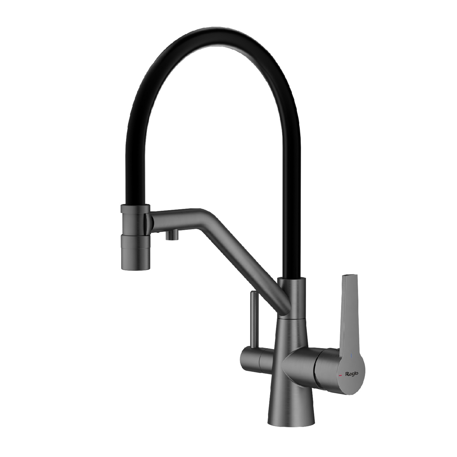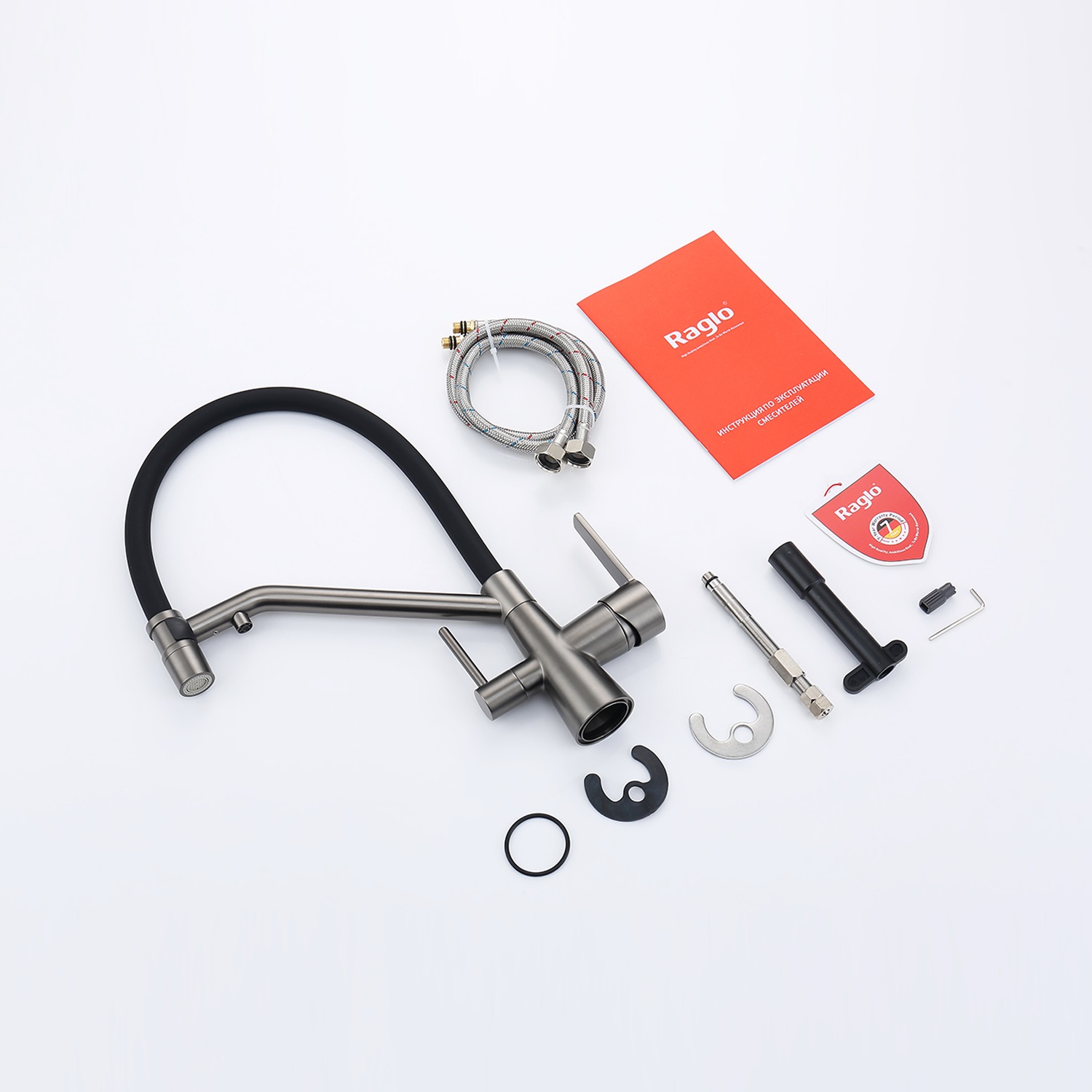 Raglo R80.62.09. Цвет: графит. Смеситель для кухни со съемным изливом на магните и подключением фильтра питьевой воды. Гибкий съемный шланг значительно расширяет зону использования смесителя, благодаря этому можно мыть объемную посуду. Модель предназначена для одновременного подключения к водопроводу и фильтру и позволяет снабжать как обычной, так и питьевой водой.