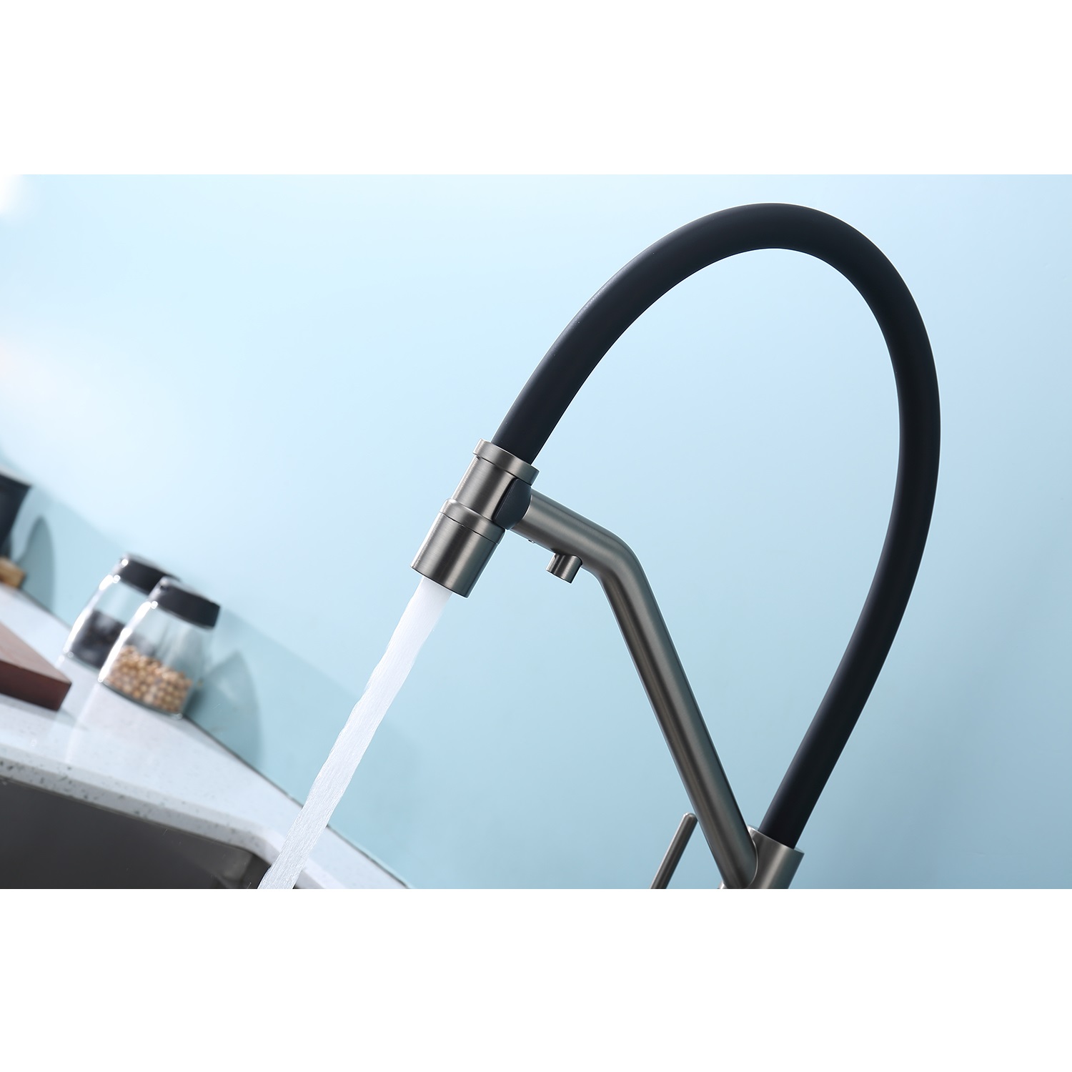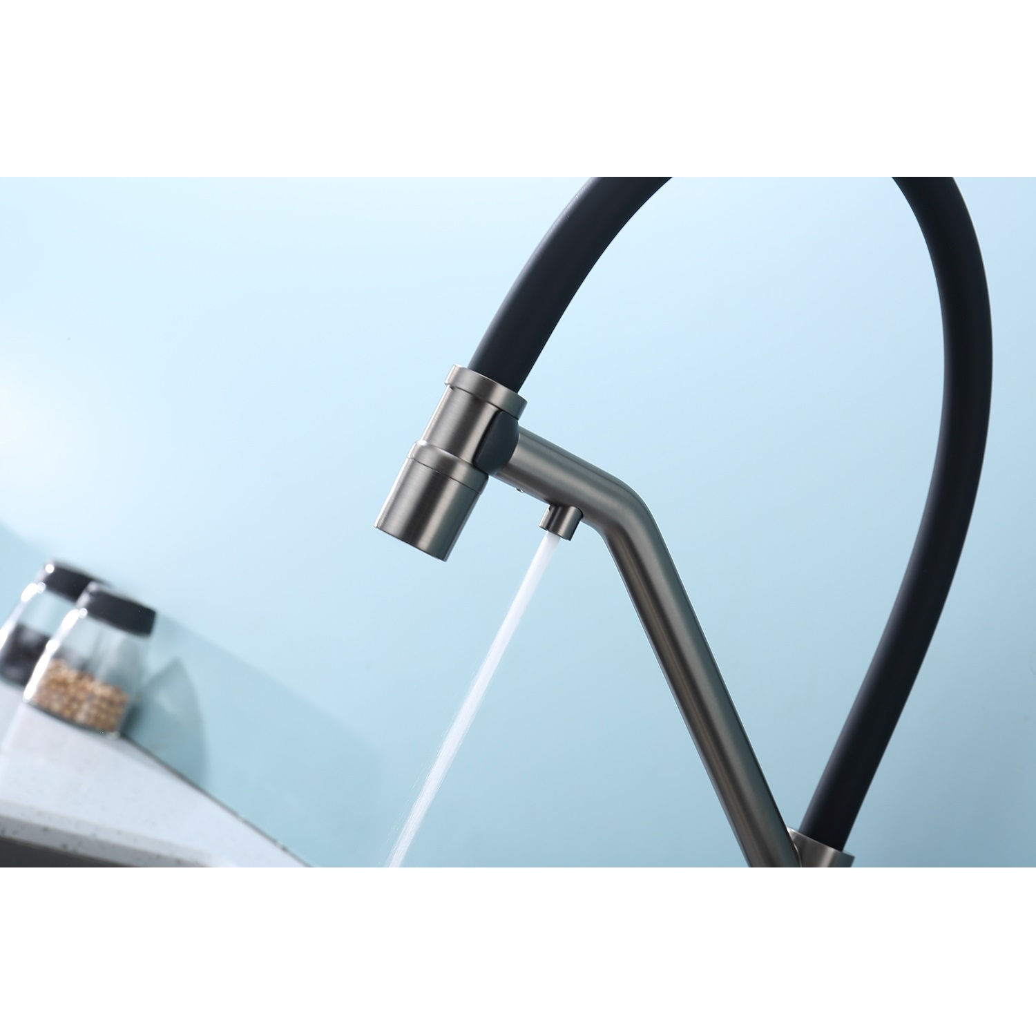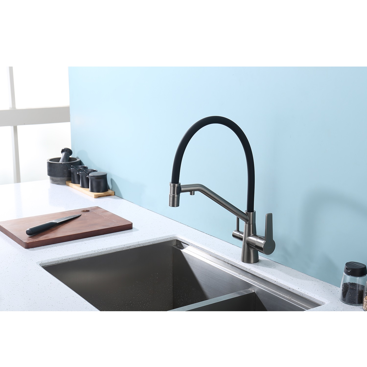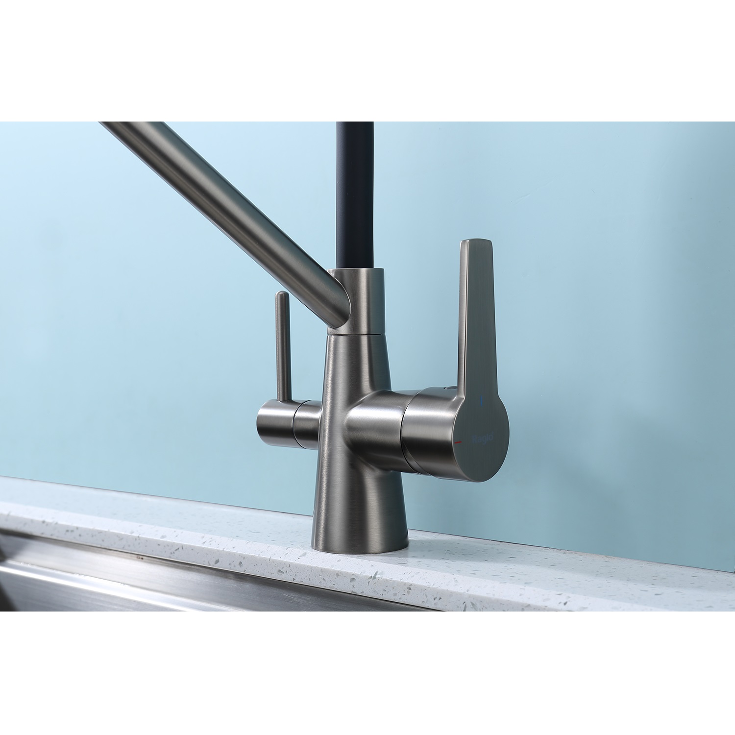 Raglo R80.62.09. Цвет: графит. Смеситель для кухни со съемным изливом на магните и подключением фильтра питьевой воды. Гибкий съемный шланг значительно расширяет зону использования смесителя, благодаря этому можно мыть объемную посуду. Модель предназначена для одновременного подключения к водопроводу и фильтру и позволяет снабжать как обычной, так и питьевой водой.