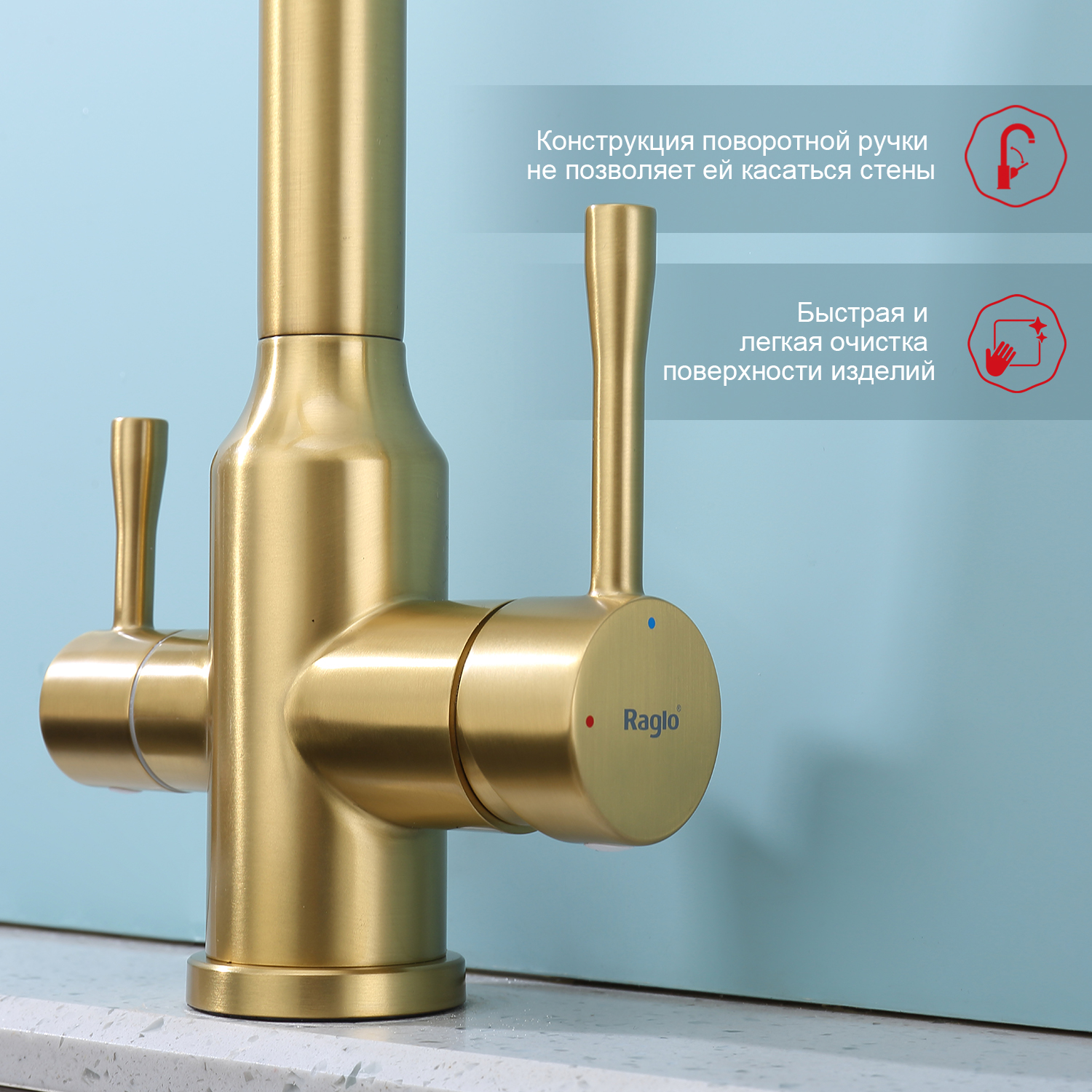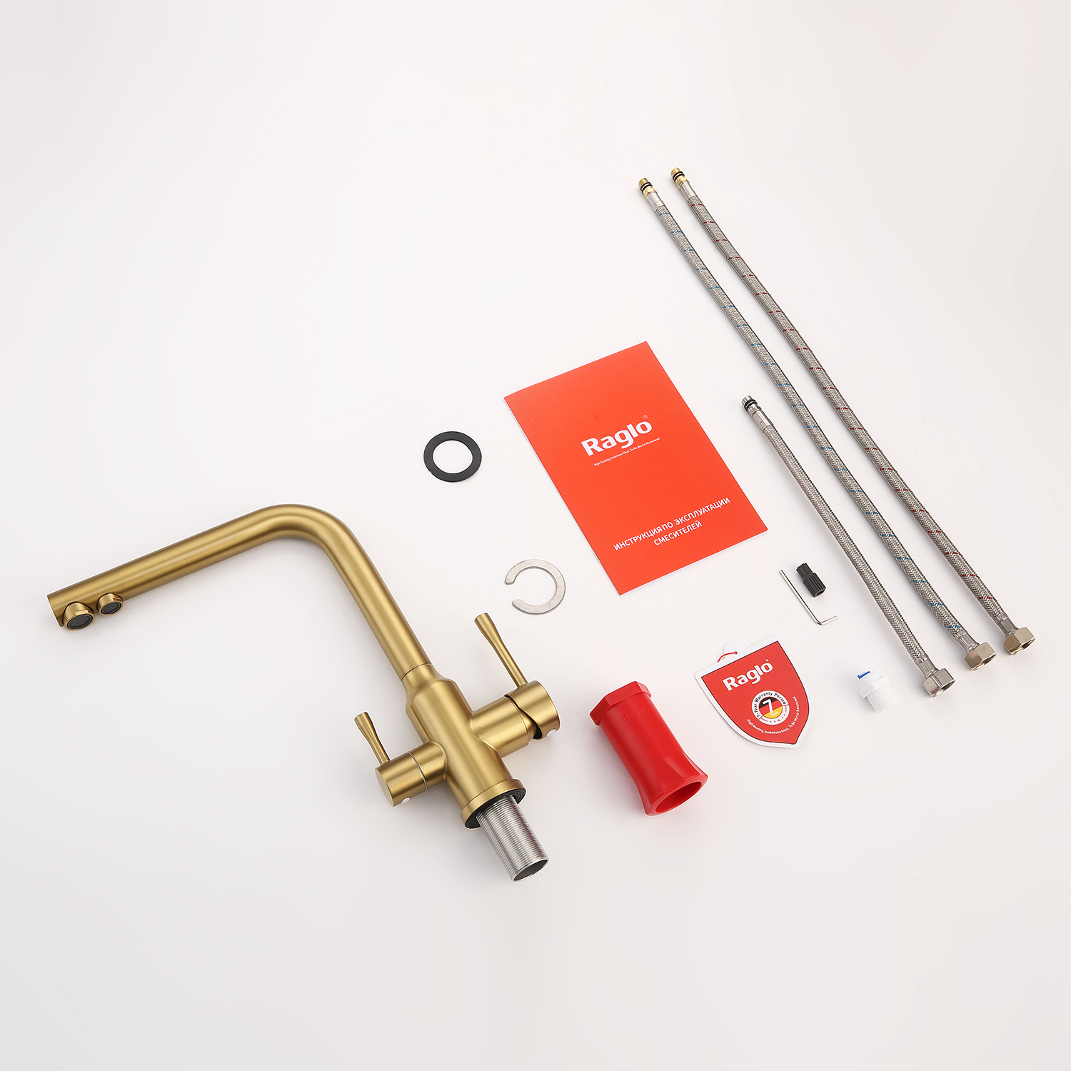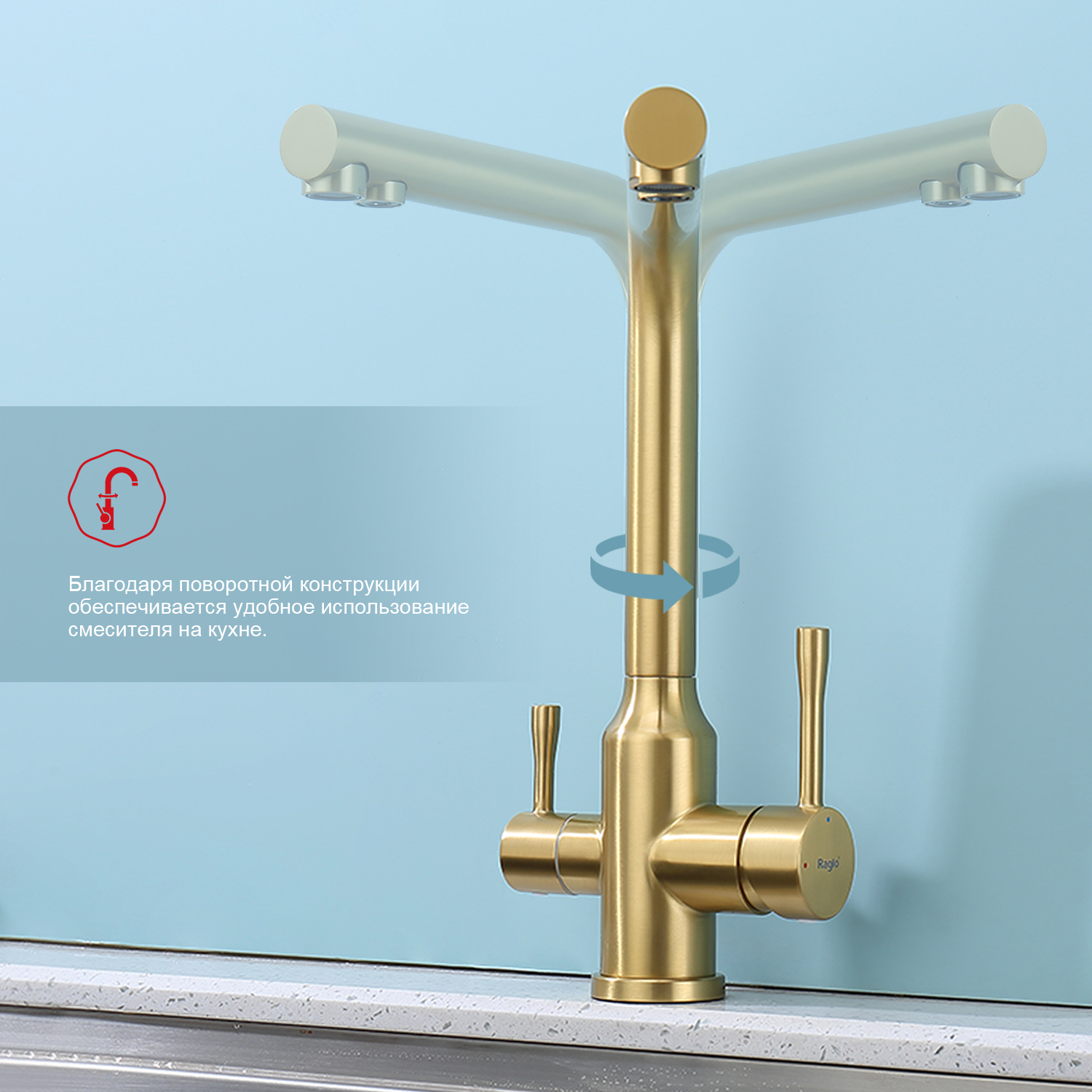 Raglo R81.61.03. Смеситель для кухни с подключением к фильтру питьевой воды. Материал: нержавеющая сталь. Управление: однорычажное. Механизм: керамический картридж. Излив: поворотный (угол поворота 360 градусов), с каналом для питьевой воды. Аэратор. Стандарт подводки: G 1/2. Тип подводки: гибкая. Отверстия для монтажа: 1. Монтаж: на мойку / на столешницу.