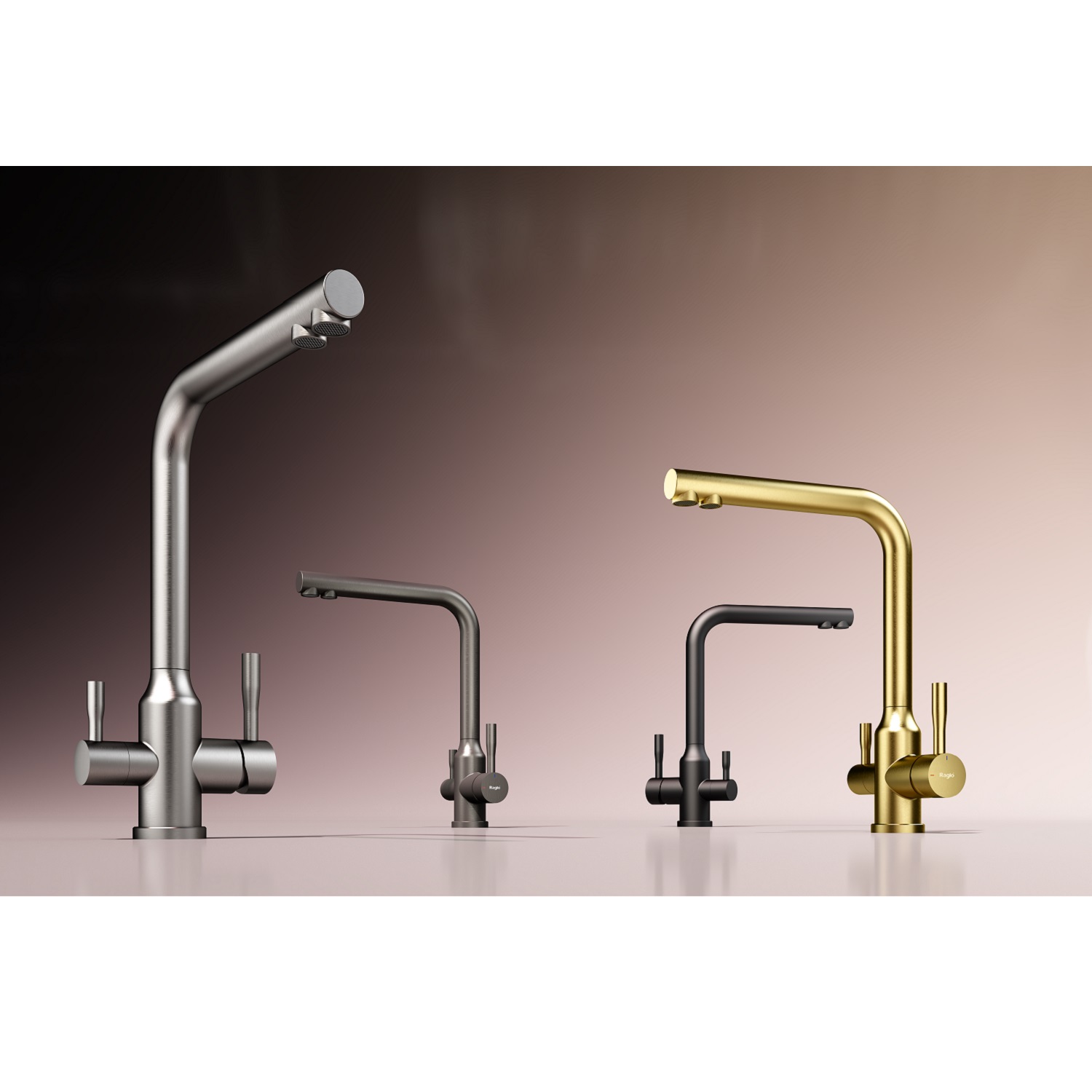 Raglo R81.61.05. Смеситель для кухни с подключением к фильтру питьевой воды. Материал: нержавеющая сталь. Управление: однорычажное. Механизм: керамический картридж. Излив: поворотный (угол поворота 360 градусов), с каналом для питьевой воды. Аэратор. Стандарт подводки: G 1/2. Тип подводки: гибкая. Отверстия для монтажа: 1. Монтаж: на мойку / на столешницу.