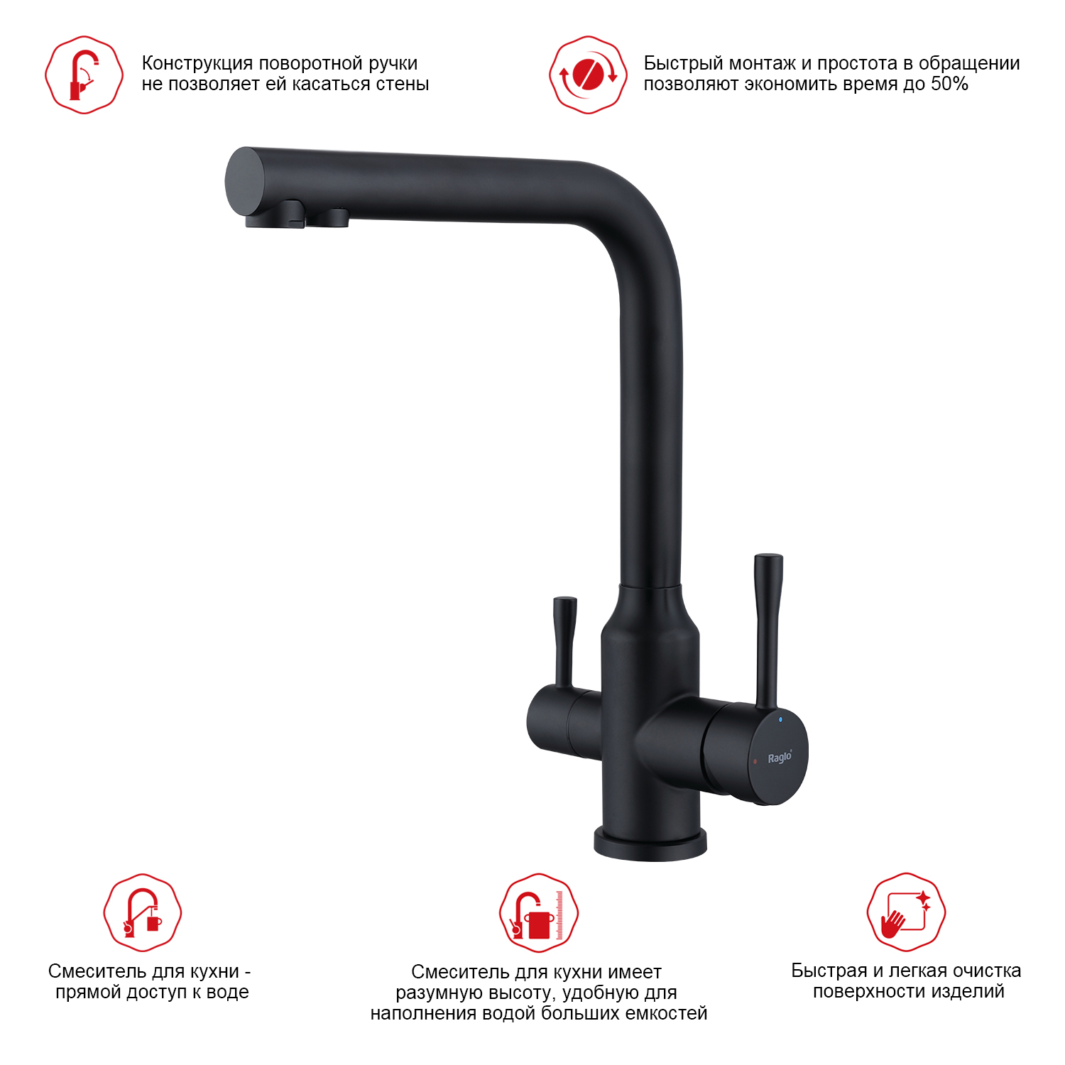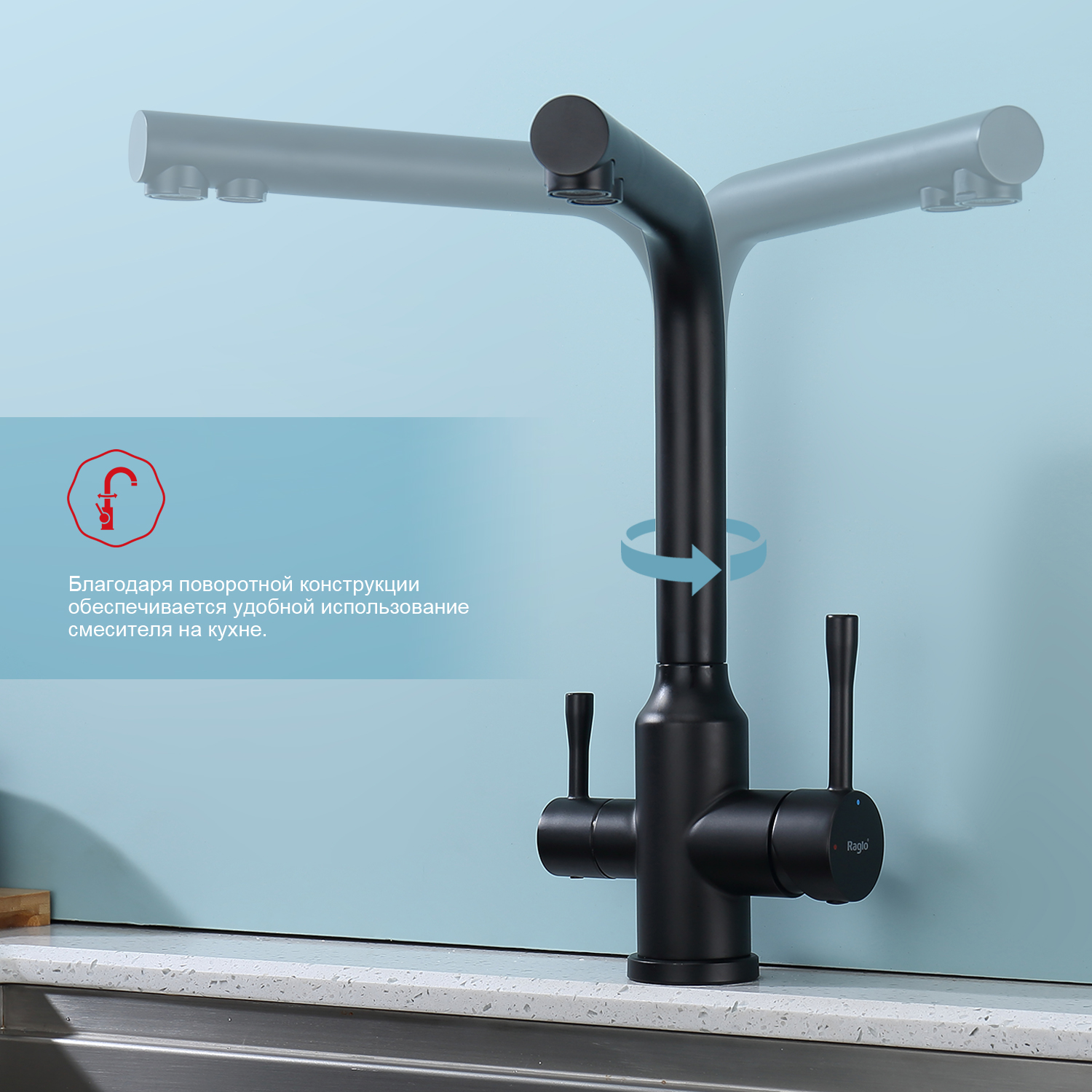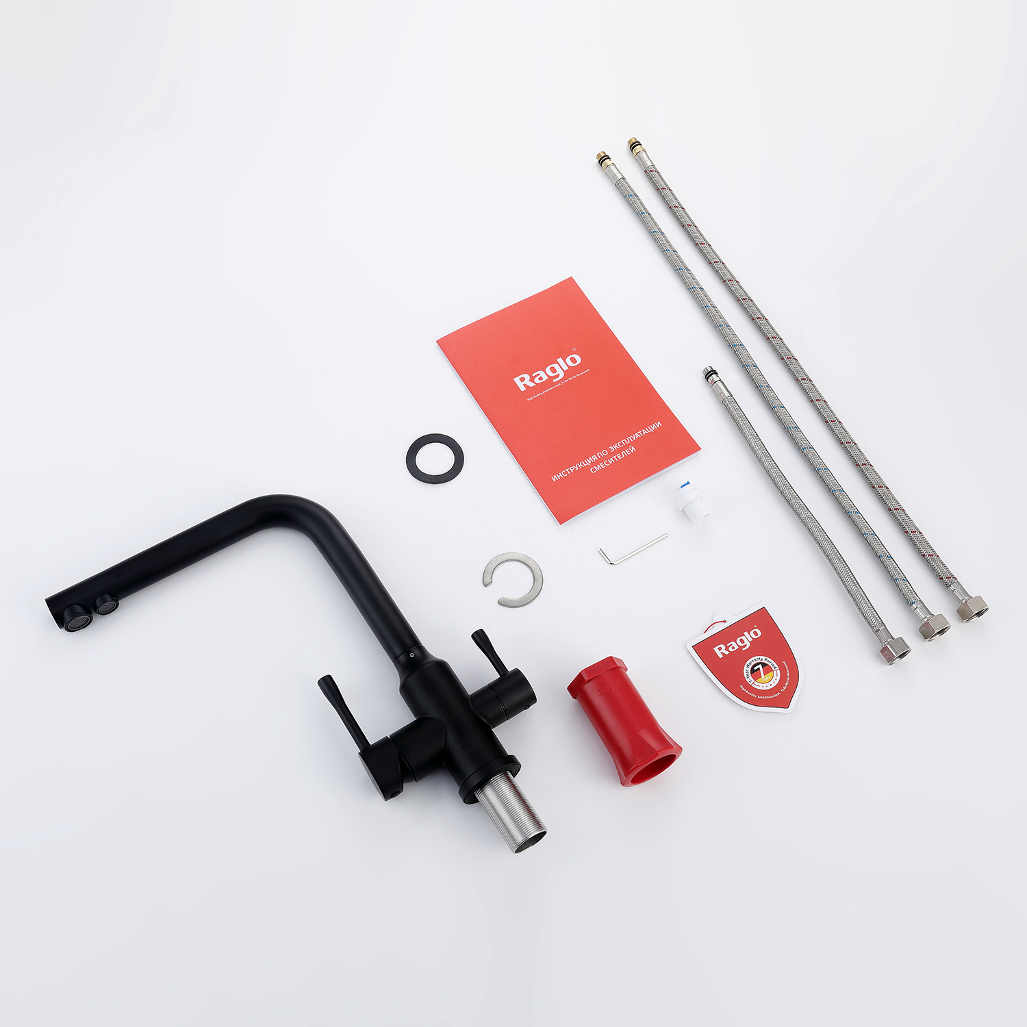 Raglo R81.61.06. Смеситель для кухни с подключением к фильтру питьевой воды. Материал: нержавеющая сталь. Управление: однорычажное. Механизм: керамический картридж. Излив: поворотный (угол поворота 360 градусов), с каналом для питьевой воды. Аэратор. Стандарт подводки: G 1/2. Тип подводки: гибкая. Отверстия для монтажа: 1. Монтаж: на мойку / на столешницу.