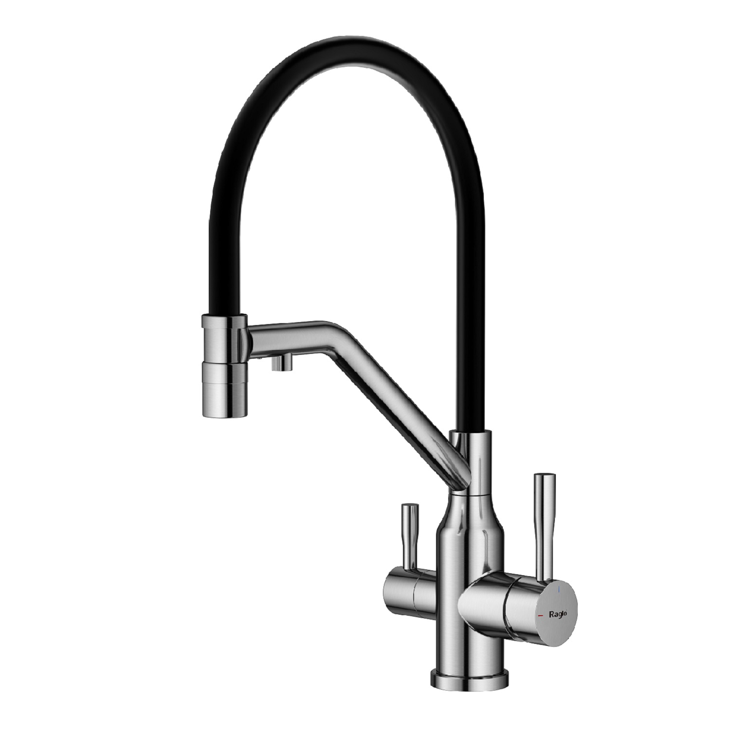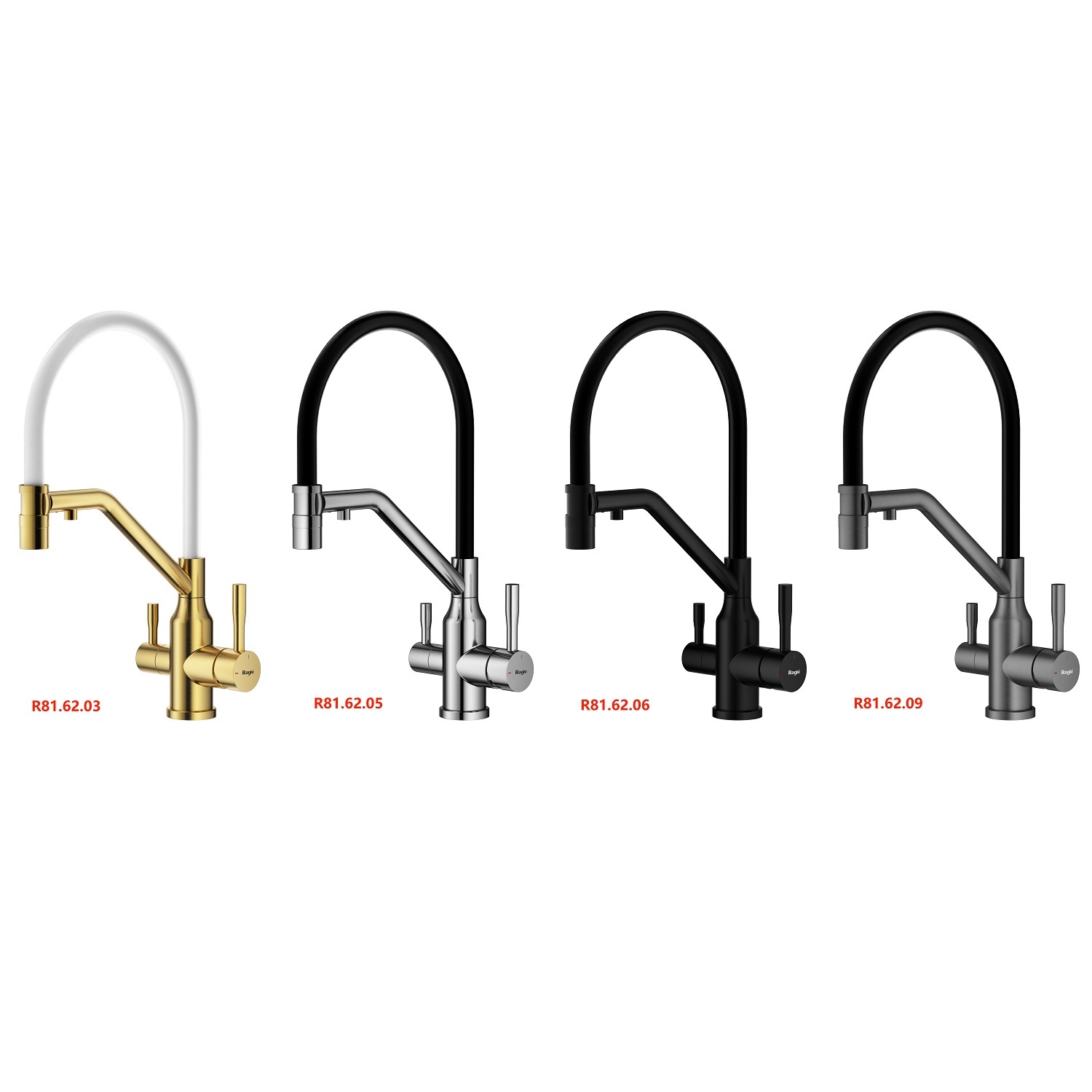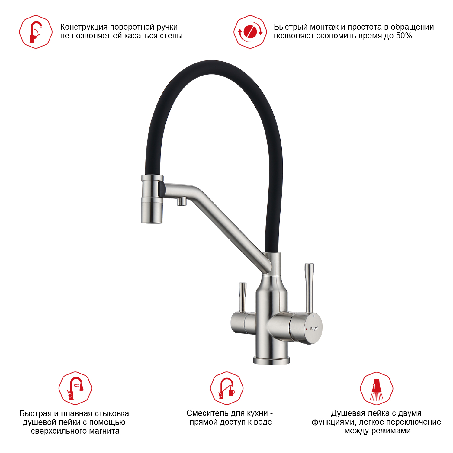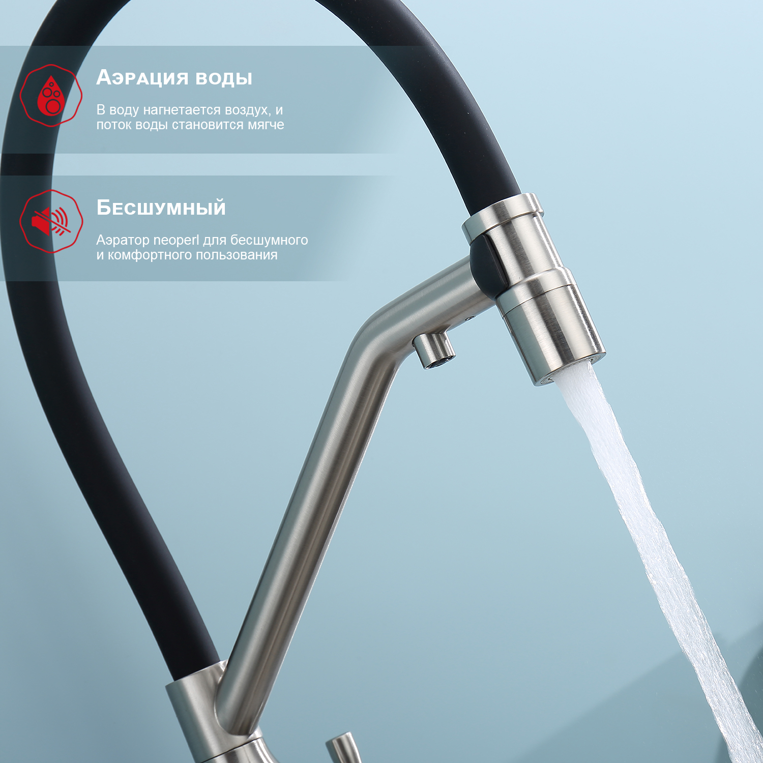 Raglo R81.62.05. Цвет: сатин. Смеситель для кухни со съемным изливом на магните и подключением фильтра питьевой воды. Гибкий излив черного цвета. Крепление на усиленной гайке. Подводка длиной 55 см имеет латунные гайки. Гарантия на смеситель 7 лет и 2 года на покрытие!