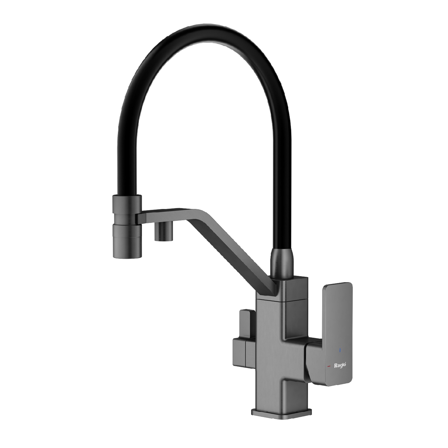 Raglo R85.62.09. Цвет: графит. Смеситель для кухни с подключением к фильтру питьевой воды. Гибкий съемный шланг значительно расширяет зону использования смесителя, благодаря этому можно мыть объемную посуду. Модель предназначена для одновременного подключения к водопроводу и фильтру и позволяет снабжать как обычной, так и питьевой водой.