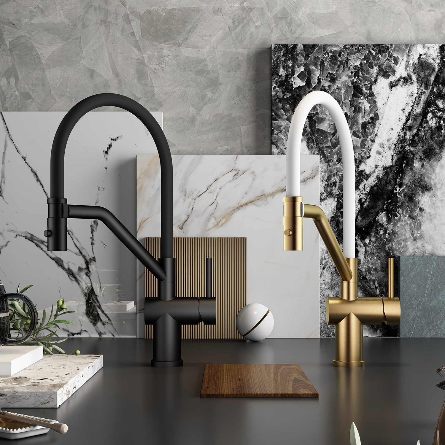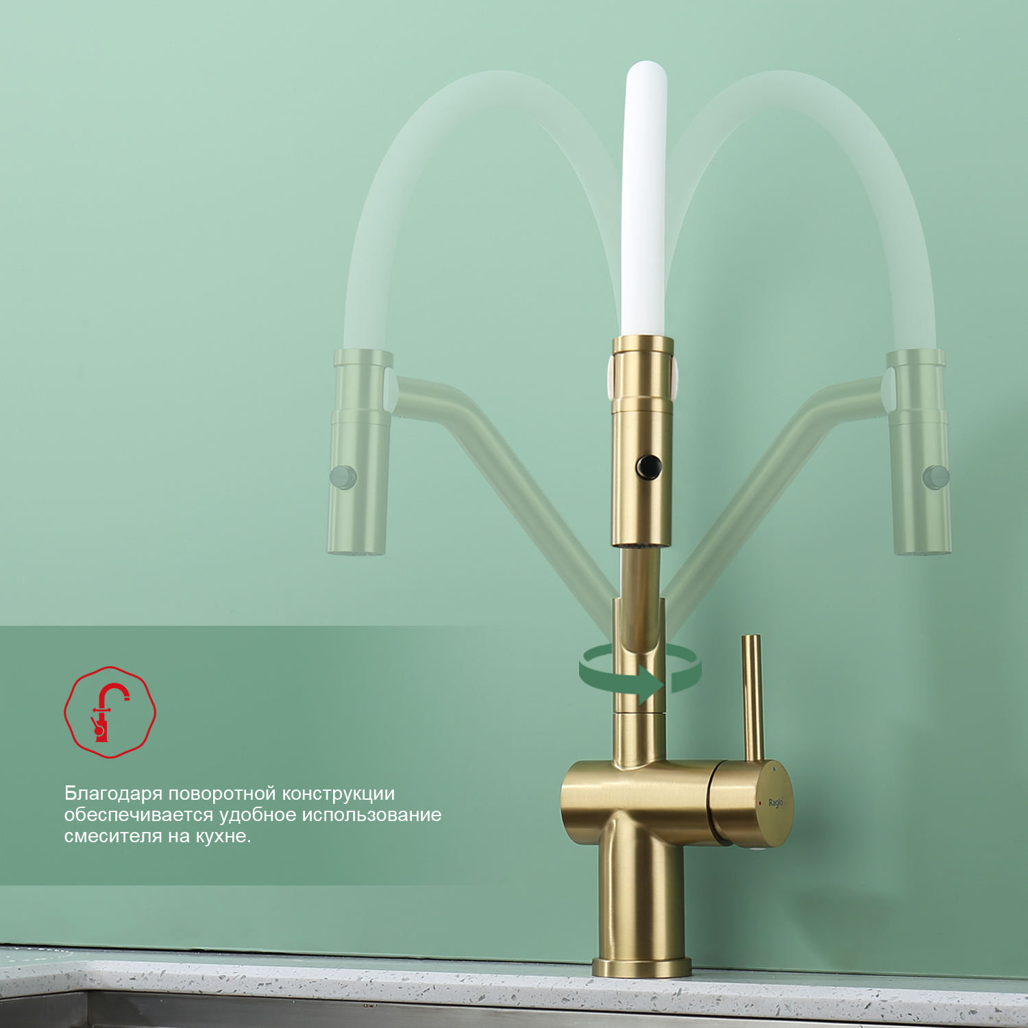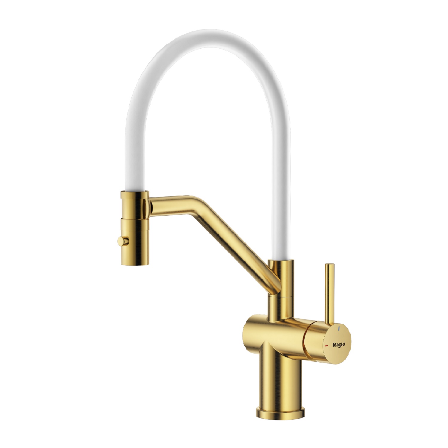 Raglo R86.41.03. Цвет: сатин золотой. Смеситель для кухни со съемным изливом на магните. Кухонные смесители торговой марки RAGLO – это оригинальность и уют для каждого дома. Кран выполнен из высококачественных материалов, что гарантирует его долговечность и надежность. Эта сантехника отличается полезным функционалом, экологичными решениями, оригинальным стилем и легкостью монтажа. Поворотный излив позволяет с большим удобством пользоваться им на кухне. Оснащен гибкой системой подключения, что облегчает его монтаж и установку. Встроенный аэратор эффективно фильтрует примеси и уменьшает шум от импульсов воды. Гладкая внутренняя стенка обеспечивает мягкий поток воды. Подходит к кухонным мойкам практически любых размеров и форм. Кухонный смеситель является неотъемлемой частью любой кухни, и данный смеситель - отличный выбор для тех, кто ценит качество, надежность и комфорт.