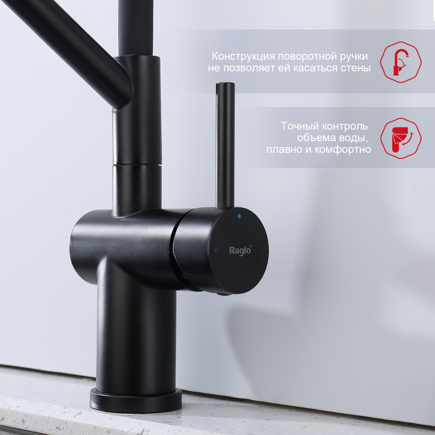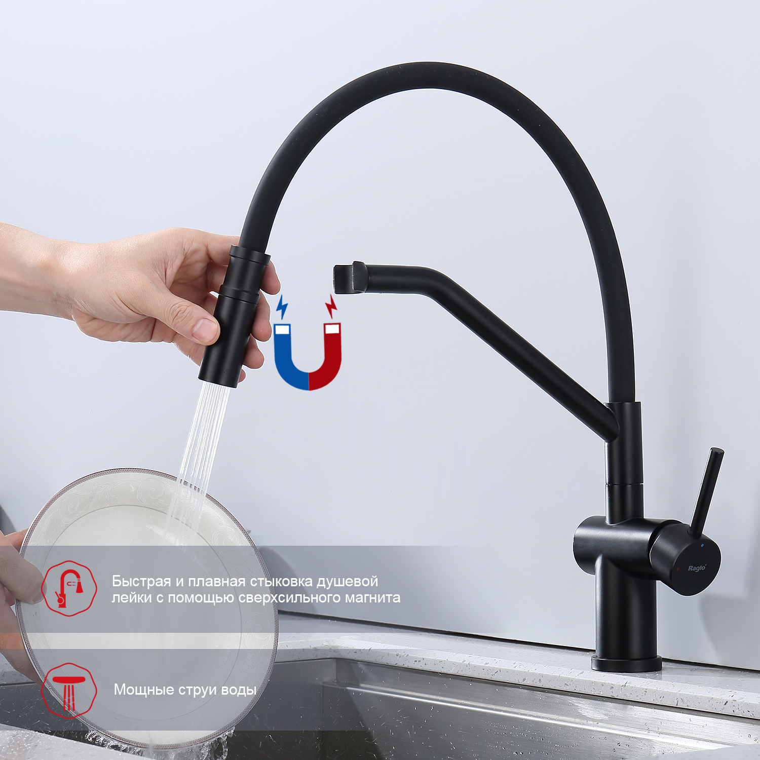 Raglo R86.41.06. Цвет: черный. Смеситель для кухни со съемным изливом на магните. Кухонные смесители торговой марки RAGLO – это оригинальность и уют для каждого дома. Кран выполнен из высококачественных материалов, что гарантирует его долговечность и надежность. Эта сантехника отличается полезным функционалом, экологичными решениями, оригинальным стилем и легкостью монтажа. Поворотный излив позволяет с большим удобством пользоваться им на кухне. Оснащен гибкой системой подключения, что облегчает его монтаж и установку. Встроенный аэратор эффективно фильтрует примеси и уменьшает шум от импульсов воды. Гладкая внутренняя стенка обеспечивает мягкий поток воды. Подходит к кухонным мойкам практически любых размеров и форм. Кухонный смеситель является неотъемлемой частью любой кухни, и данный смеситель - отличный выбор для тех, кто ценит качество, надежность и комфорт.