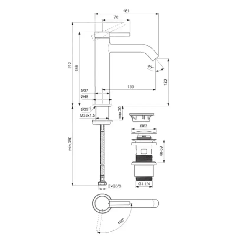 CERALINE NUOVO Смеситель для раковины H120 с независимым донным клапаном Click, керамический картридж FirmaFlow 28 мм с функцией HWTC (ограничение максимальной температуры горячей воды), металлическая рукоятка с индикаторами горячей / холодной воды, аэратор 3,8 л/мин, система монтажа EASY-FIX (облегченный монтаж), гибкая подводка G3/8", технология Blue Start. Упаковка без пластика.