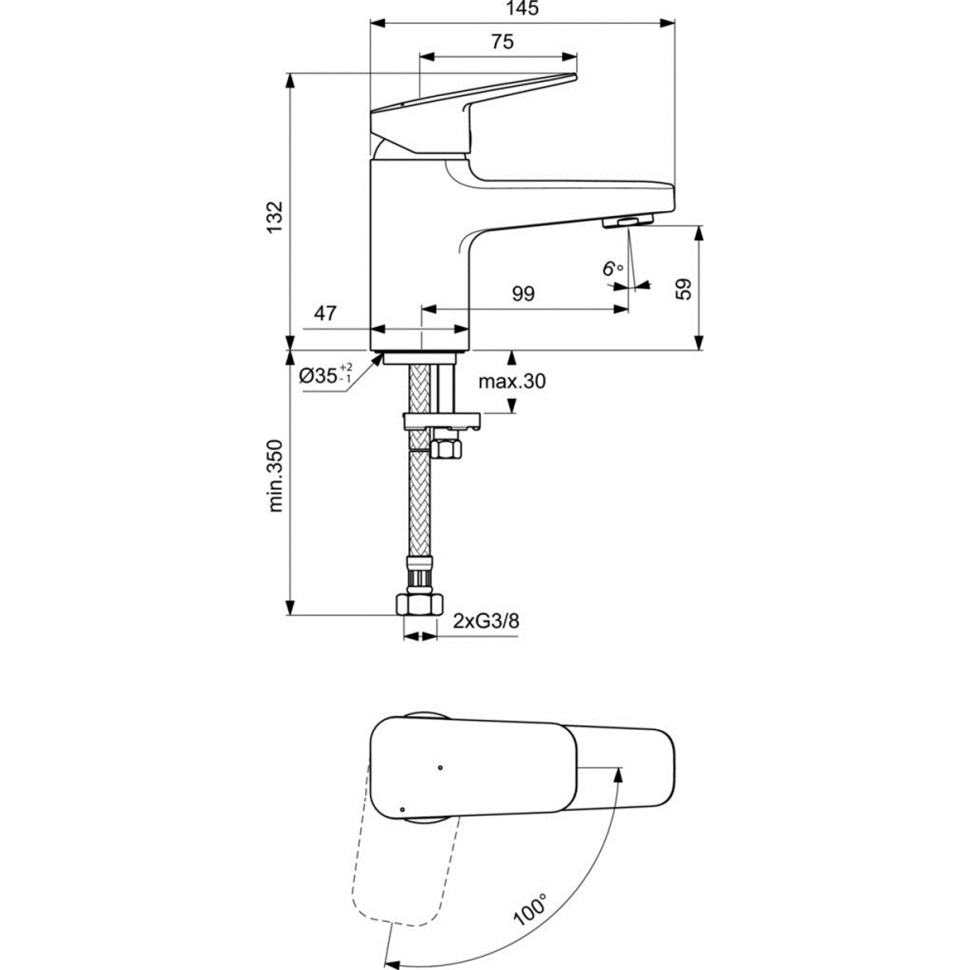 CERAPLAN Смеситель для раковины без донного клапана, технология Blue Start, система монтажа EASY-FIX (облегченный монтаж), гибкая подводка G3/8", картридж FirmaFlow 38 мм с функцией HWTC (ограничение максимальной температуры горячей воды), металлическая рукоятка с индикаторами горячей / холодной воды, аэратор Slim с ограничением потока 5 л/мин