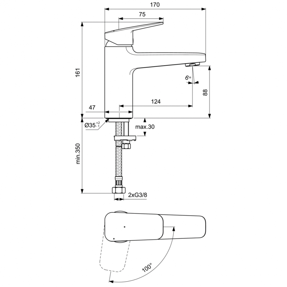 CERAPLAN Смеситель для раковины без донного клапана, технология Blue Start, система монтажа EASY-FIX (облегченный монтаж), гибкая подводка G3/8", картридж FirmaFlow 38 мм с функцией HWTC (ограничение максимальной температуры горячей воды), металлическая рукоятка с индикаторами горячей / холодной воды, аэратор Slim с ограничением потока 5 л/мин