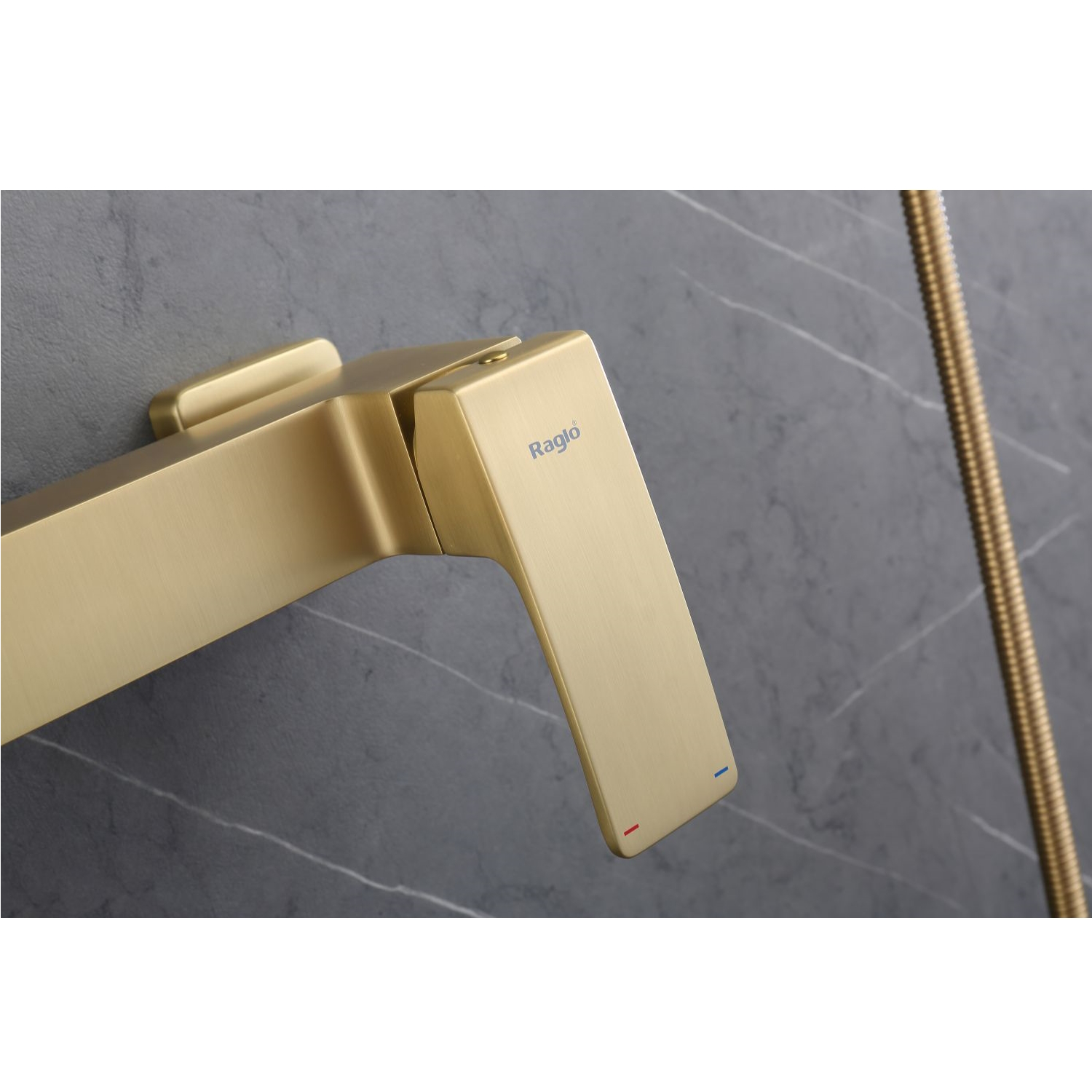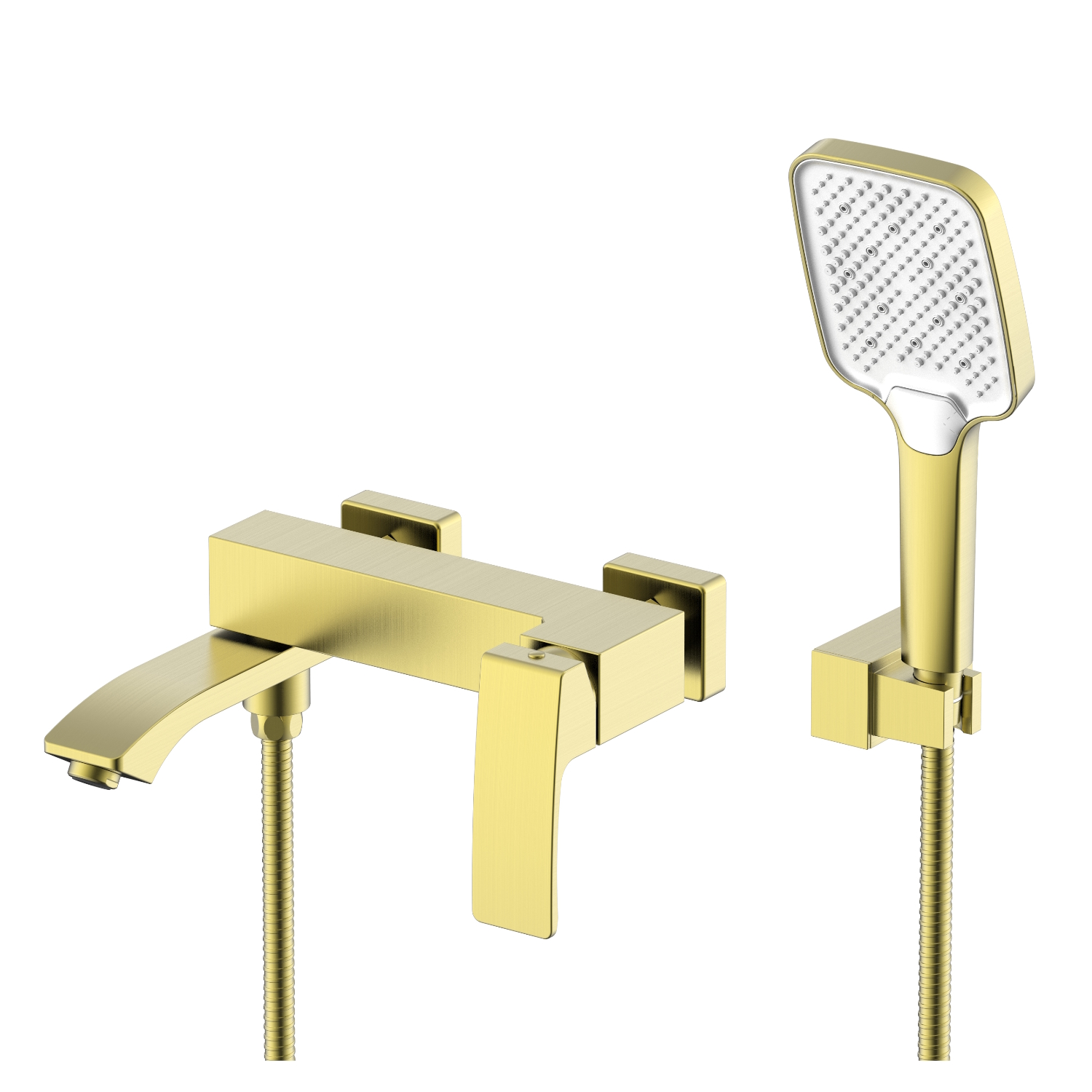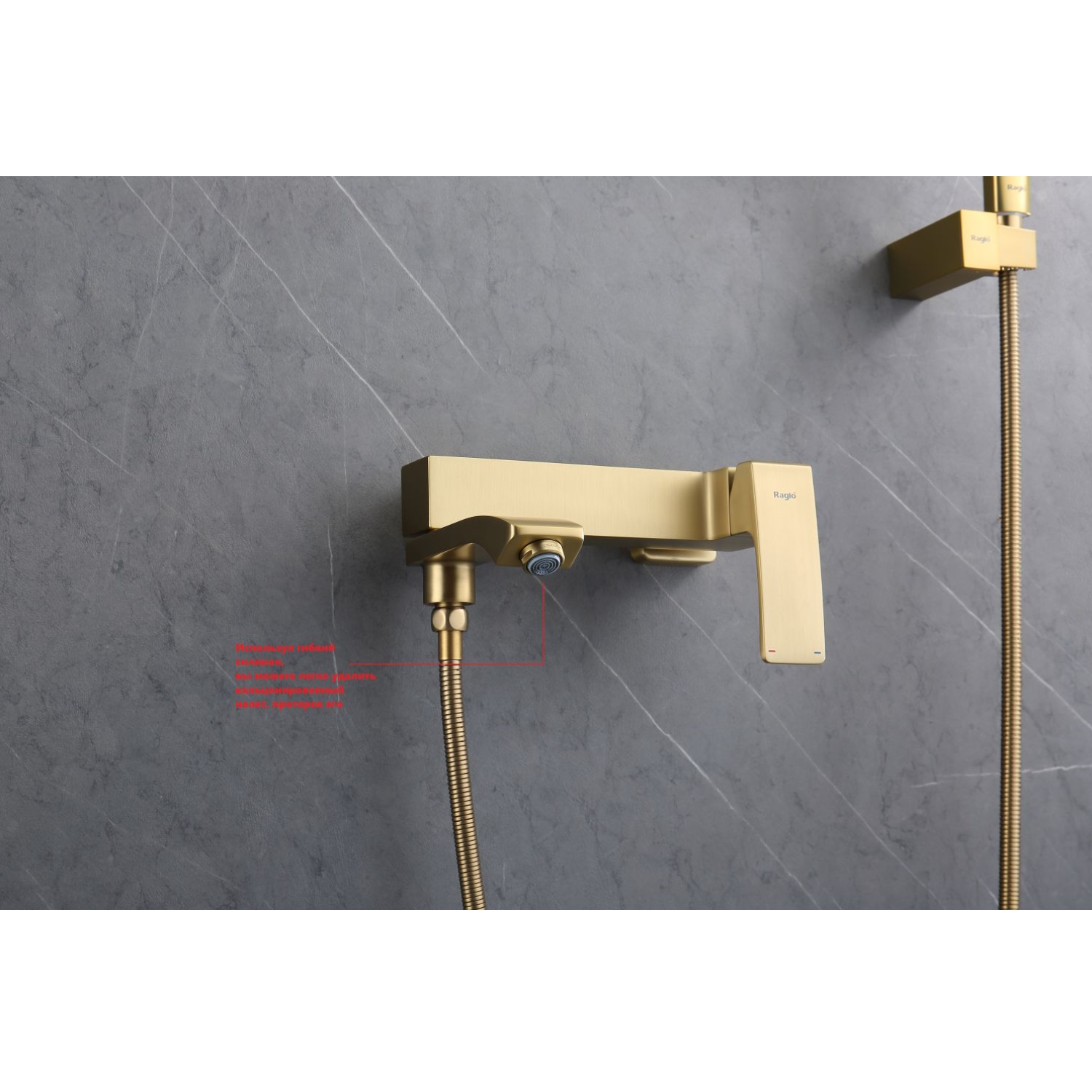 Смеситель для ванны Raglo R01.30.03. Цвет: сатин золотой. Материал: латунь. Управление: однорычажное. Механизм: керамический картридж. Излив: поворотный. Количество режимов струи ручного душа: 3.
