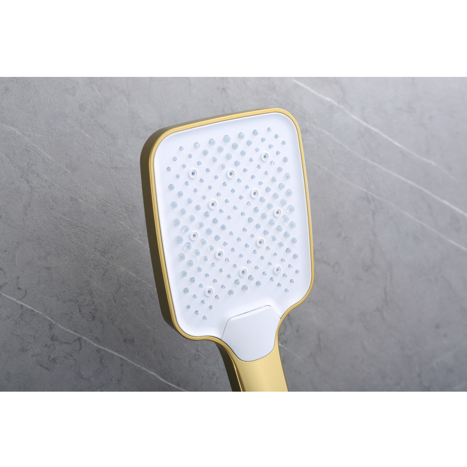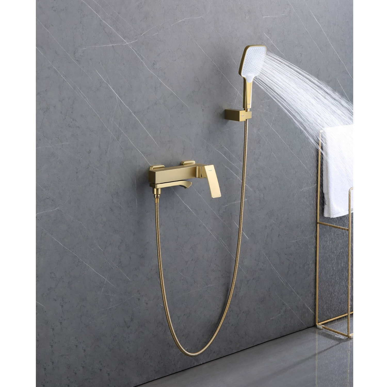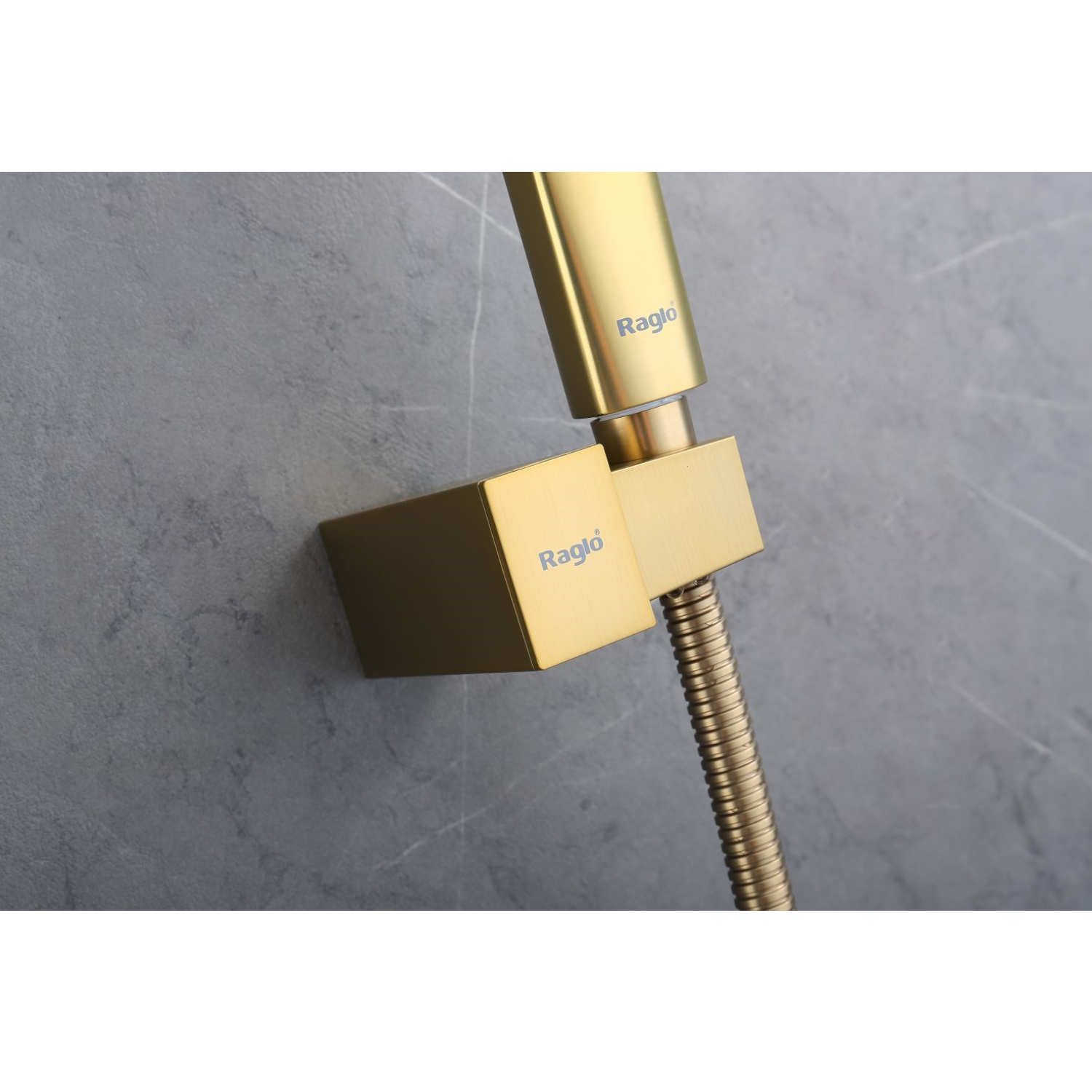 Смеситель для ванны Raglo R01.30.03. Цвет: сатин золотой. Материал: латунь. Управление: однорычажное. Механизм: керамический картридж. Излив: поворотный. Количество режимов струи ручного душа: 3.