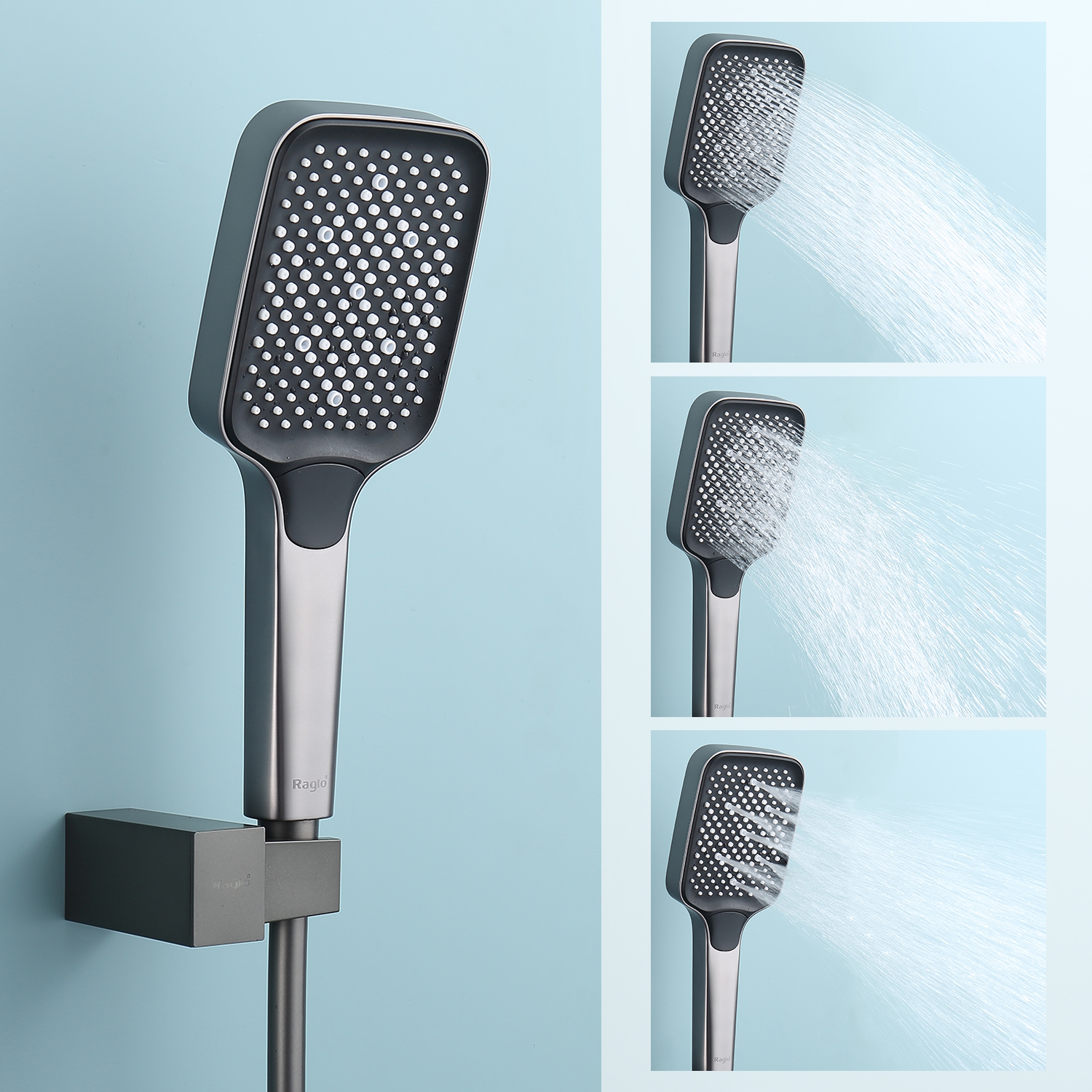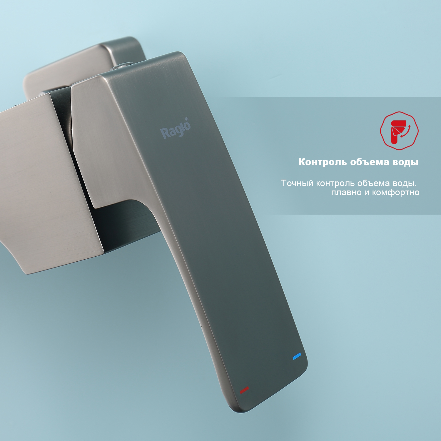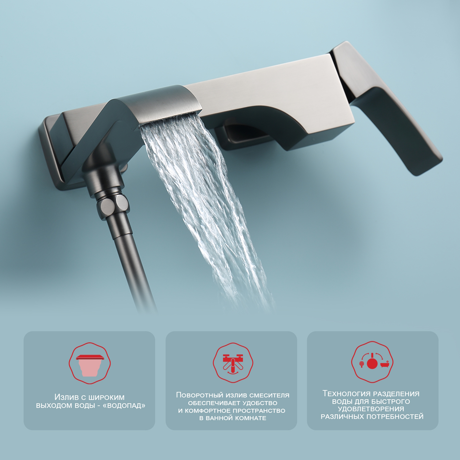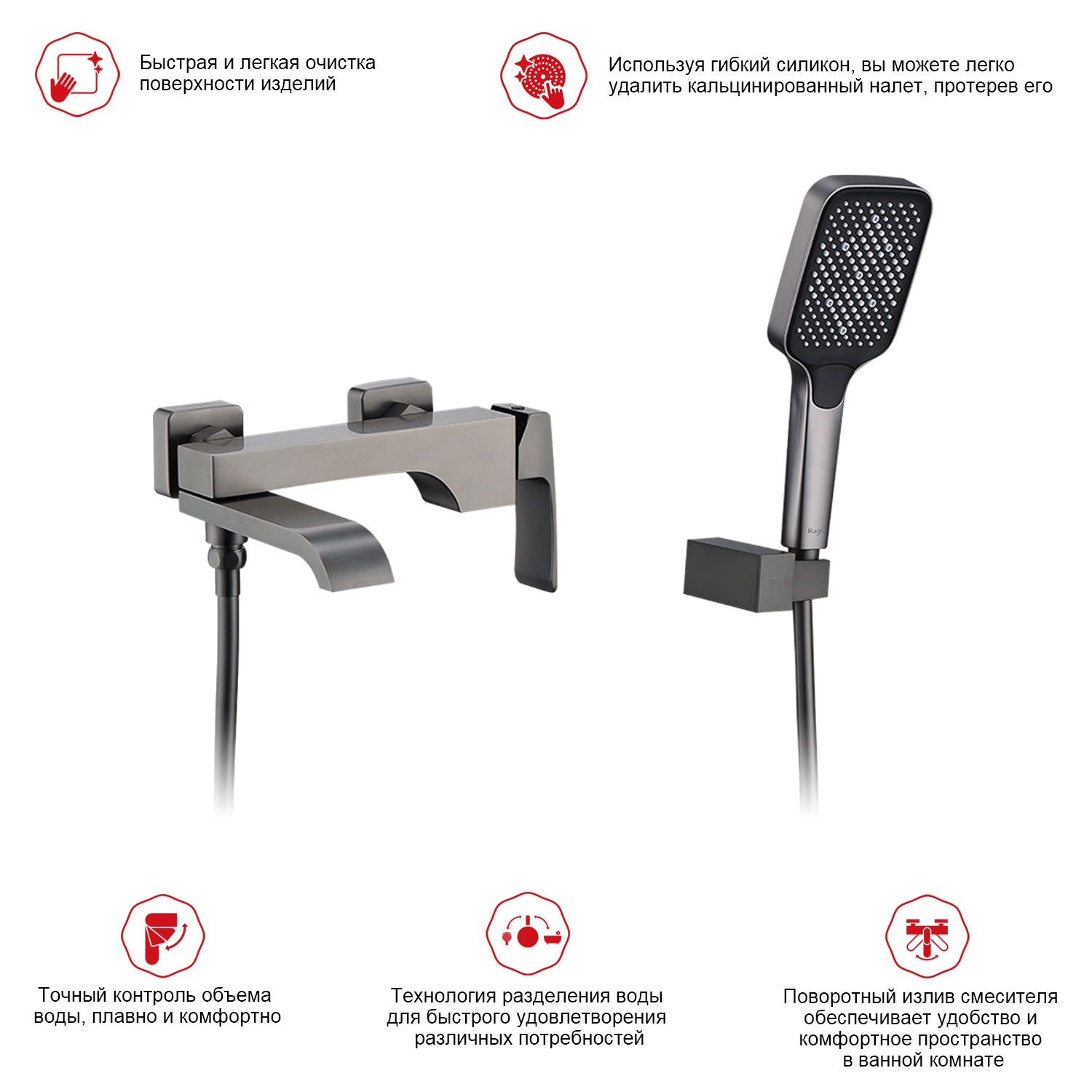 Смеситель для ванны Raglo R02.30.09. Цвет: графит. Материал: латунь. Управление: однорычажное. Механизм: керамический картридж. Излив: поворотный. Тип излива: каскадный. Количество режимов струи ручного душа: 3. Отверстия для монтажа: 2. Монтаж: на стену.