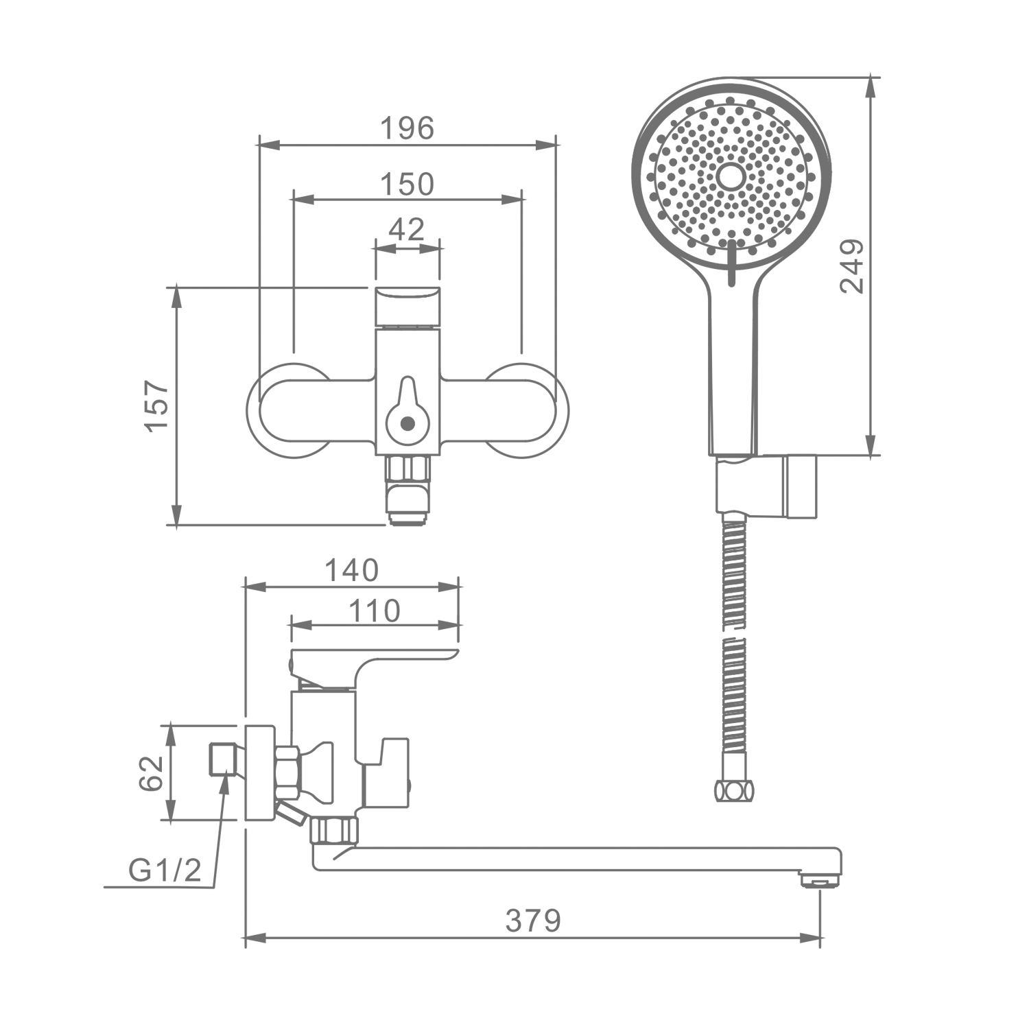 Форма ручного душа: круглая. Количество режимов струи ручного душа: 3. Переключатель ванна/душ. Отверстия для монтажа: 2. Монтаж: на стену.