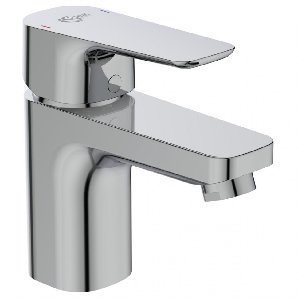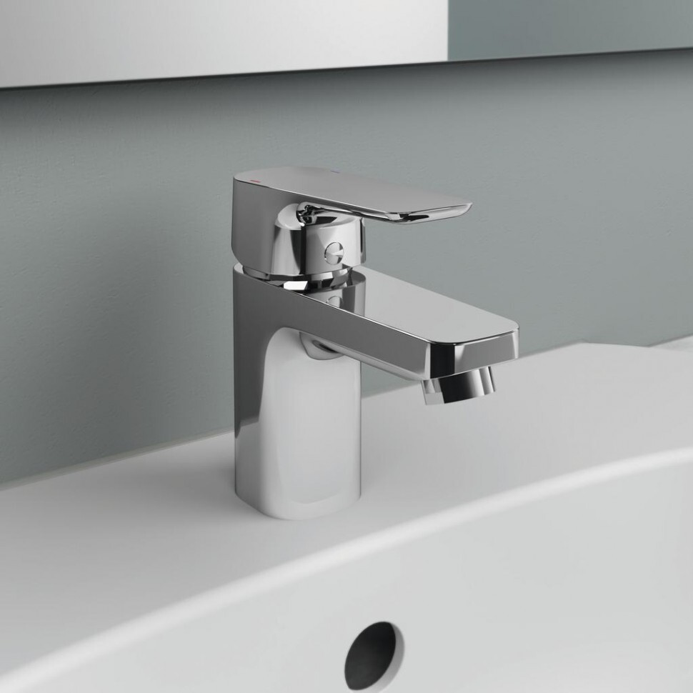 CERAPLAN III SLIM Однорукоятковый смеситель для умывальника с цепочкой, система монтажа EASY-FIX (облегченный монтаж), гибкая подводка G3/8" (шланги PEX), керамический картридж FirmaFlow 38 мм с функцией HWTC (ограничение максимальной температуры горячей воды), с функцией CLICK (ограничение потока воды), с цепочкой, металлическая рукоятка с индикаторами горячей / холодной воды, аэратор Cascade M24 x1