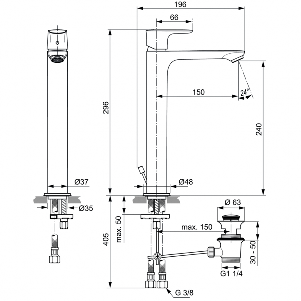 CONNECT AIR Vessel Смеситель для умывальника, тонкий корпус 36 мм, технология Blue Start, система монтажа EASY-FIX (облегченный монтаж), аэратор Perlator с ограничением потока 5 л/мин., керамический картридж 25 мм без функции HWTC, без функции CLICK, гибкая подводка PEX G3/8" 400 мм, металлический донный клапан