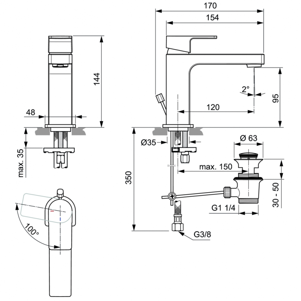 EDGE Однорукоятковый смеситель для умывальника, Технология Blue Start, керамический картридж 25 мм без функции HWTC, без функции CLICK, гибкая подводка G3/8" (антибактериальные шланги PEX), Система облегченного монтажа EASY-FIX (облегченный монтаж) аэратор Perlator с ограничением потока 5 л/мин., металлическая рукоятка с индикаторами горячей / холодной воды (индикатор холодной воды расположен по центру), металлический донный клапан
