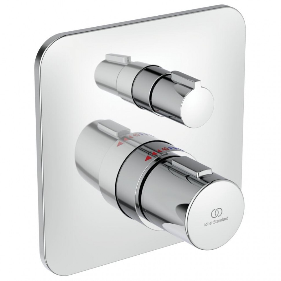 TONIC II Термостатический индивидуальный встраиваемый смеситель для душа, комплект №2 (внешняя часть), термостатический картридж (новая технология), затворы на керамических дисках G1/2 180?, клапаны на керамических дисках 90o, без душевого гарнитура, пластиковая рукоятка с ограничителем температуры (40oC), металлическая плоская накладка. Для монтажа с A1000NU