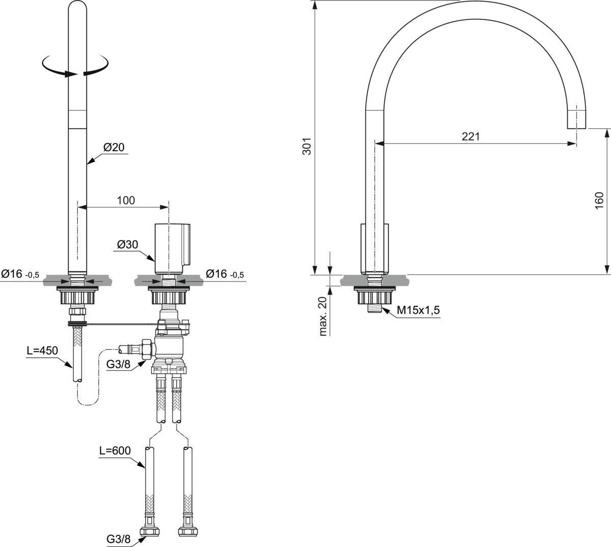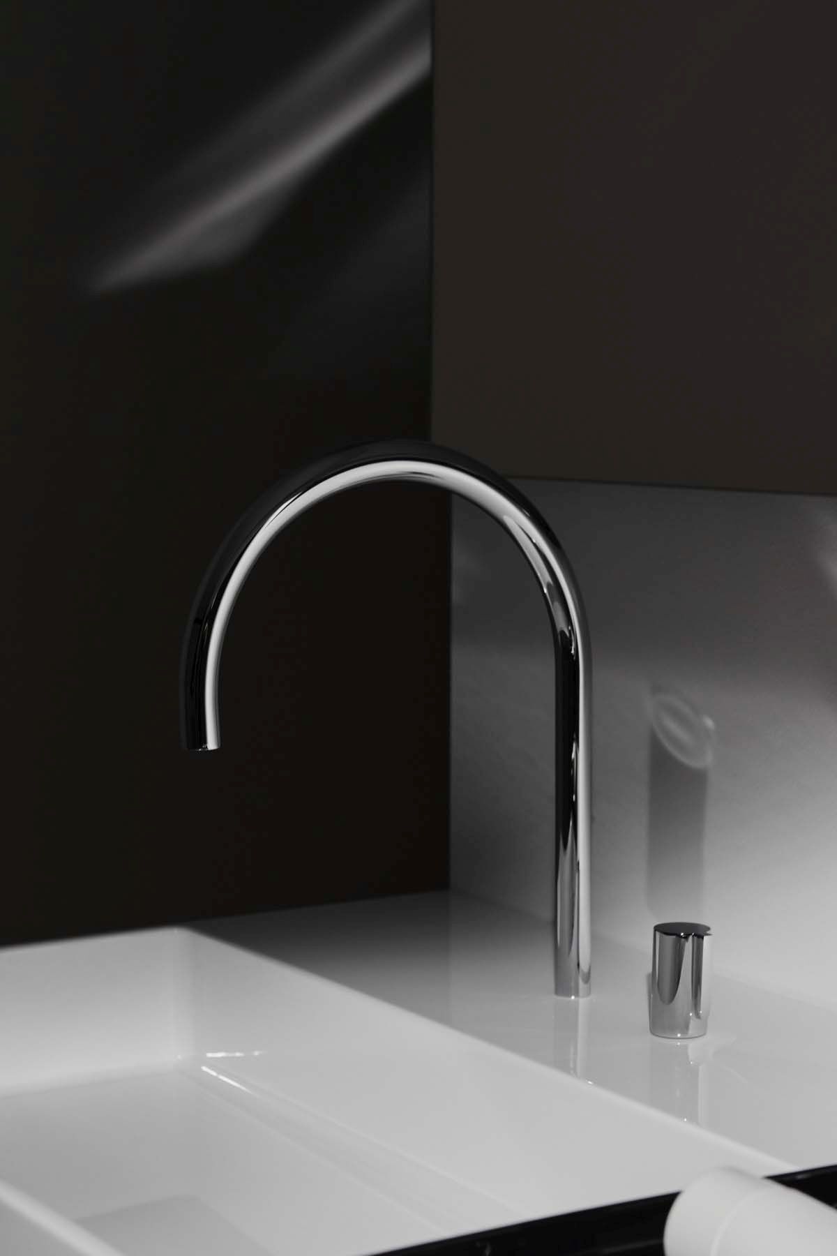 SOLOS Набортный смеситель для раковины под 2 отверстия, с цикловым затвором, металлическая рукоятка, круглый поворотный трубчатый излив, аэратор Cache 5л/мин, латунные подключения для излива и рукоятки, гибкая подводка G3/8". Для монтажа с раковинами Solos