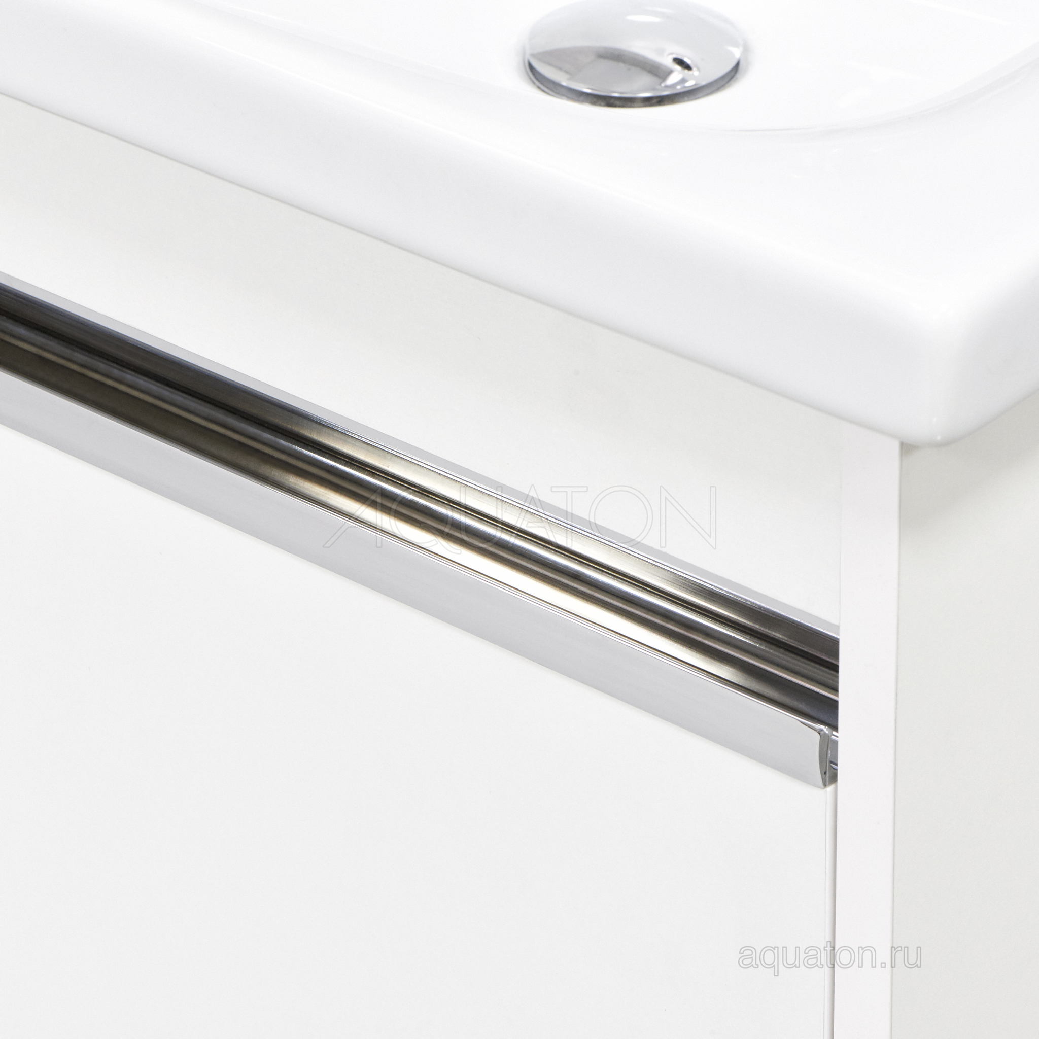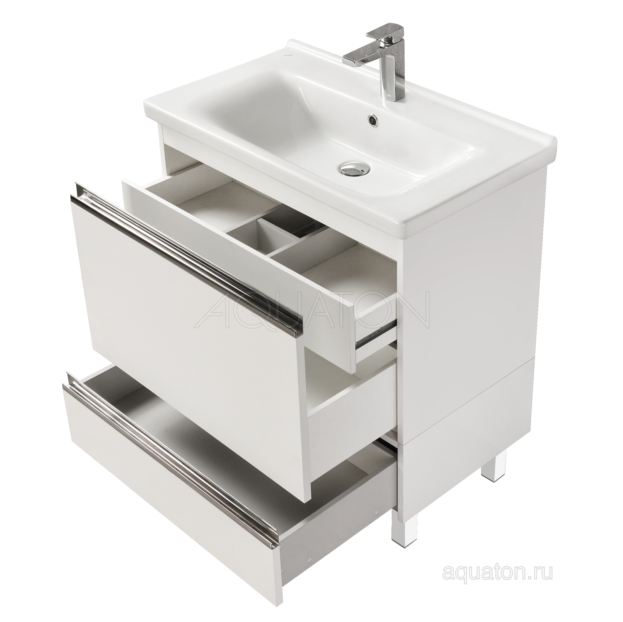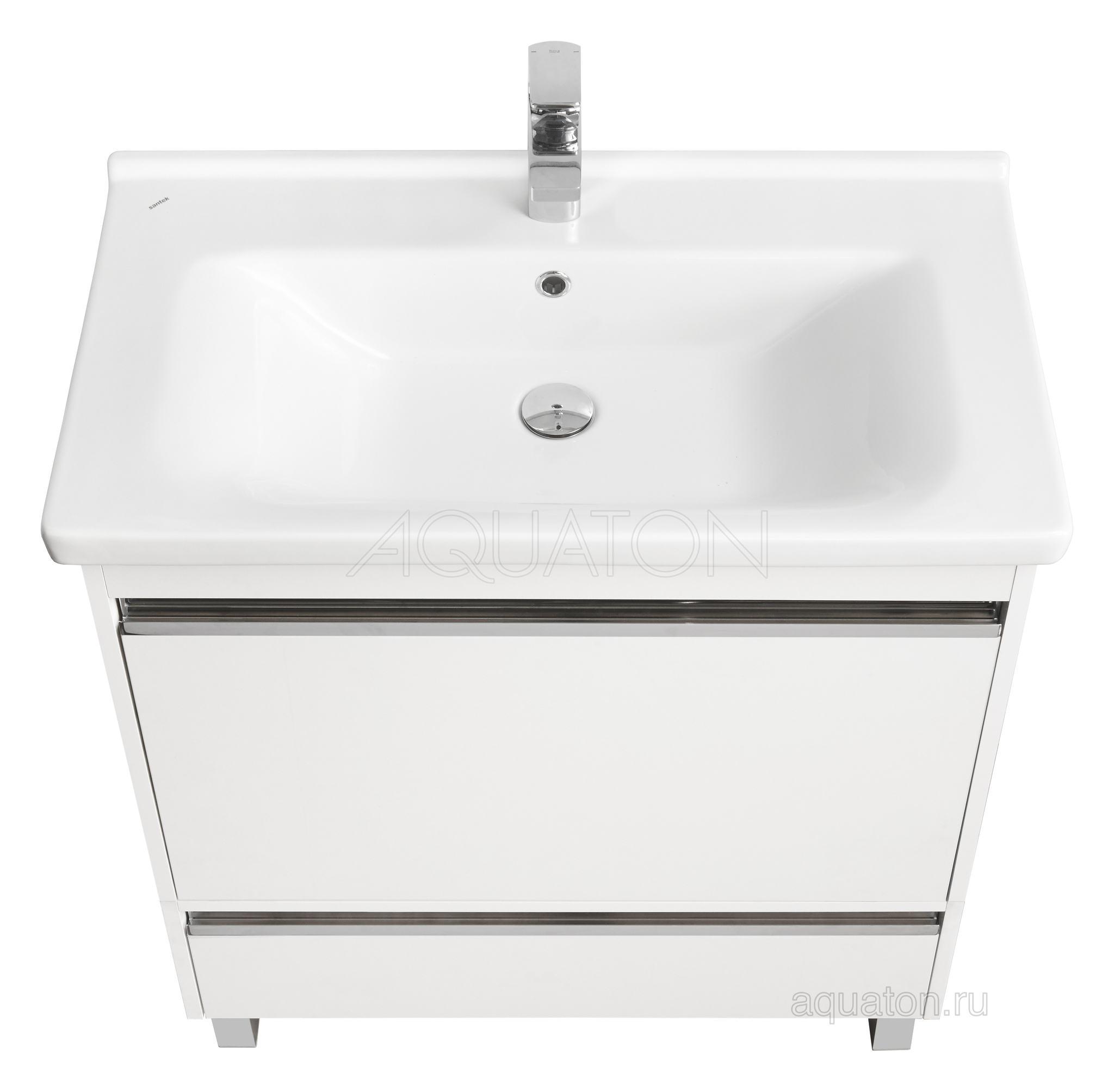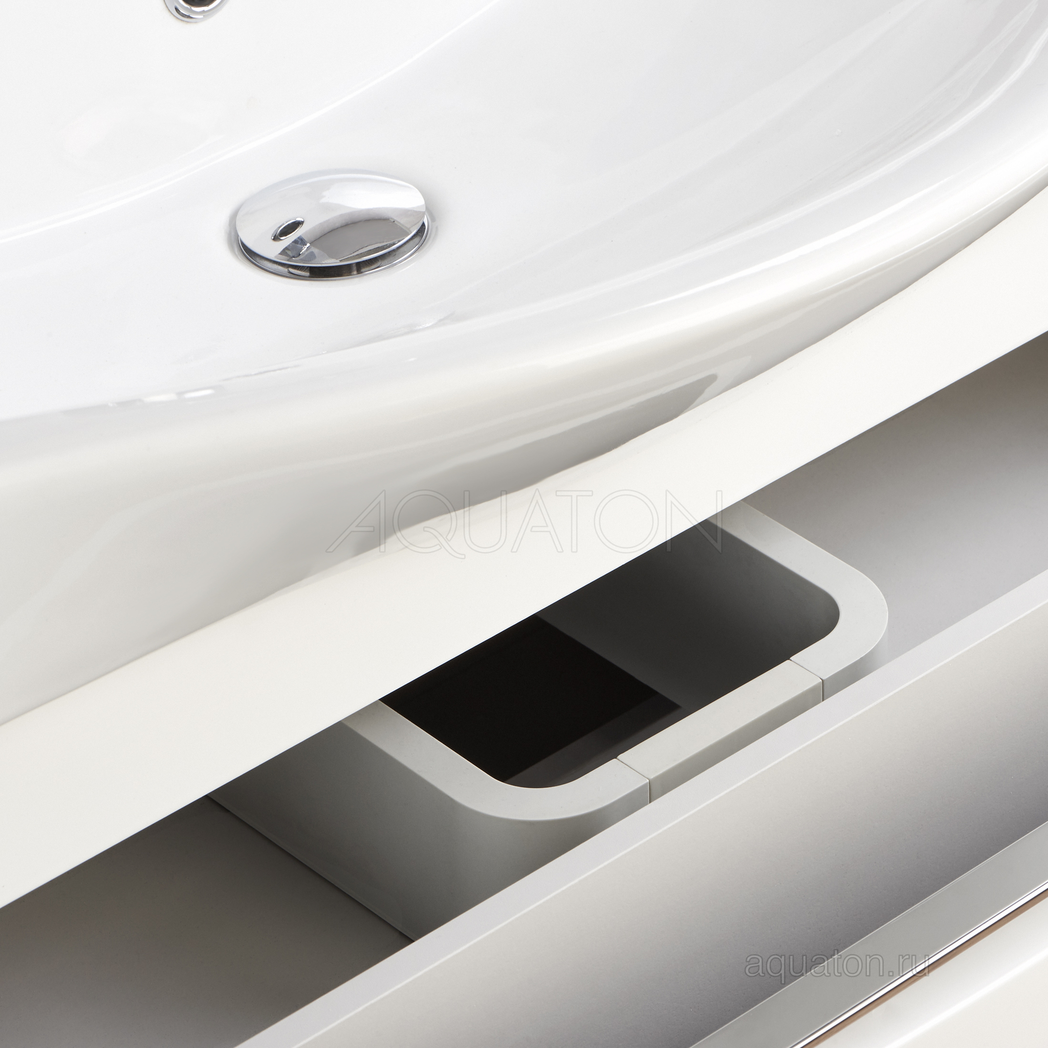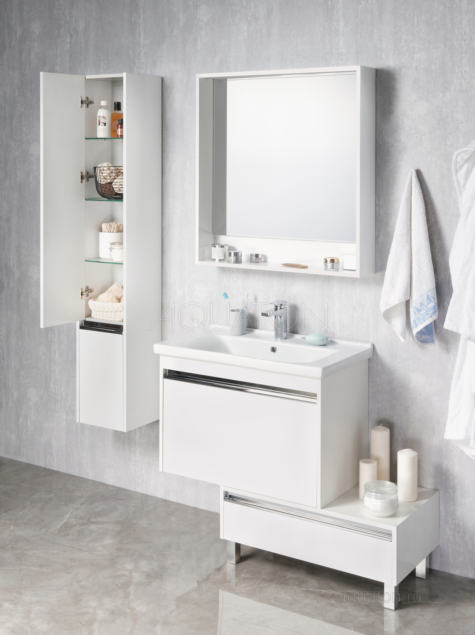 Широкая тумба под раковину Капри 80 от AQUATON в цвете белый глянец отражает современные тенденции в дизайне мебели для ванных комнат: минимализм в чистом виде с простыми и понятными формами, отсутствие лишних деталей, удобные профильные ручки, интегрированные в фасад. Корпус и фасады выполнены из влагостойкой ЛДСП и покрыты глянцевой краской. Тумба предлагает удобную систему хранения, что особенно актуально для тех, кто ценит порядок во всем. Модель оборудована двумя вместительными ящиками. Комфорт и удобство при использовании гарантируют направляющие с доводчиками и интегрированная система плавного закрывания. В качестве дополнения к подвесной тумбе предлагается дополнительный комод на ножках, который может быть установлен как непосредственно под тумбой, так и со смещением влево или вправо.