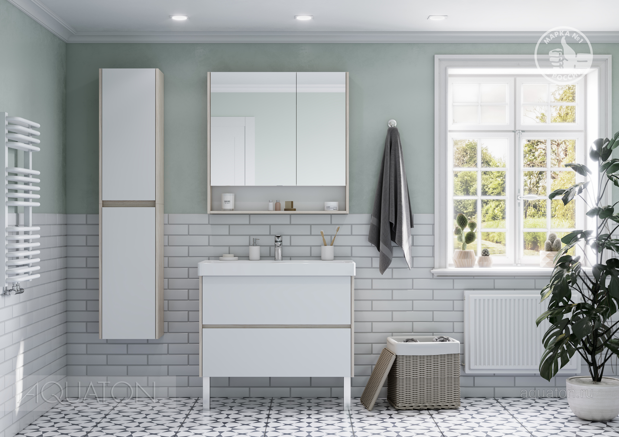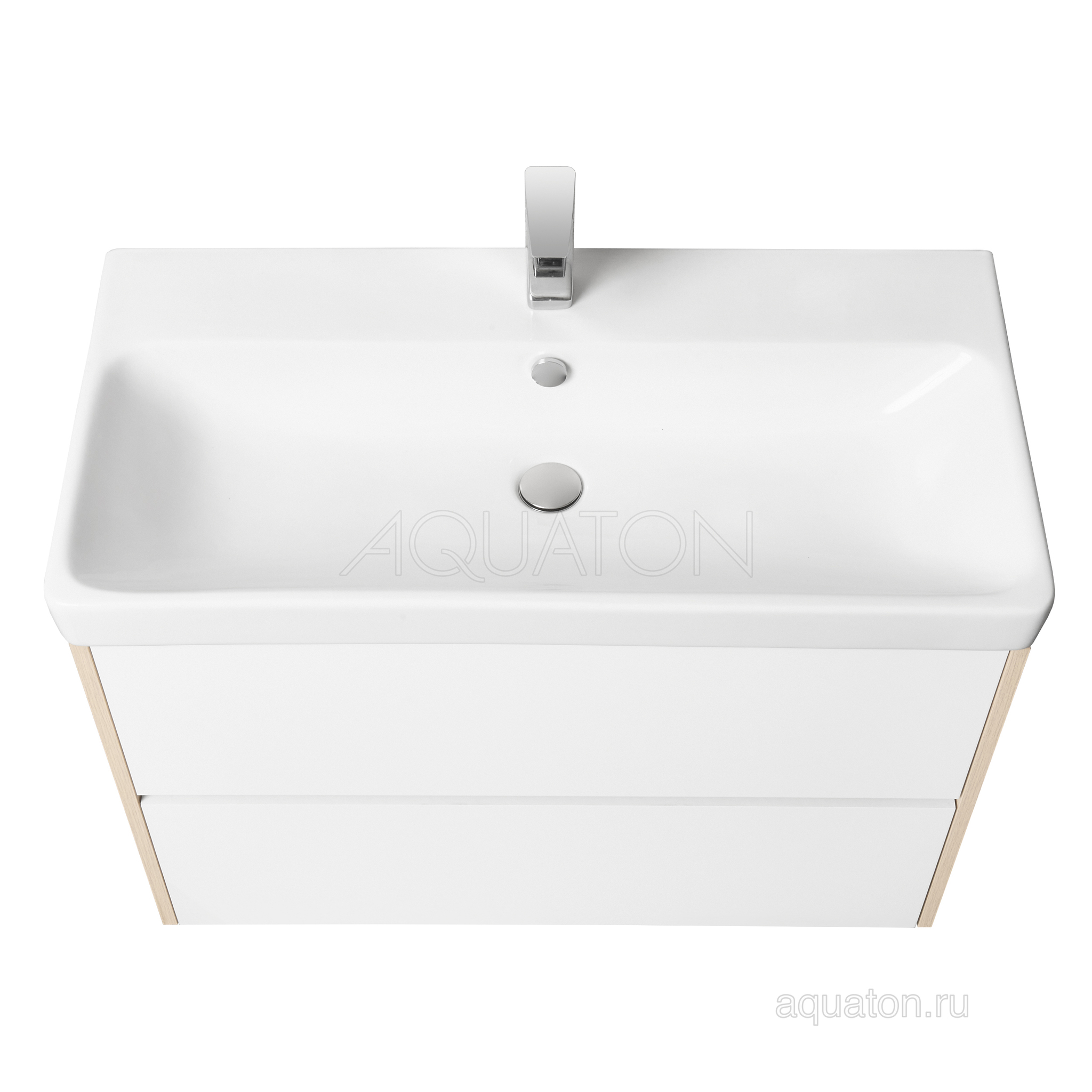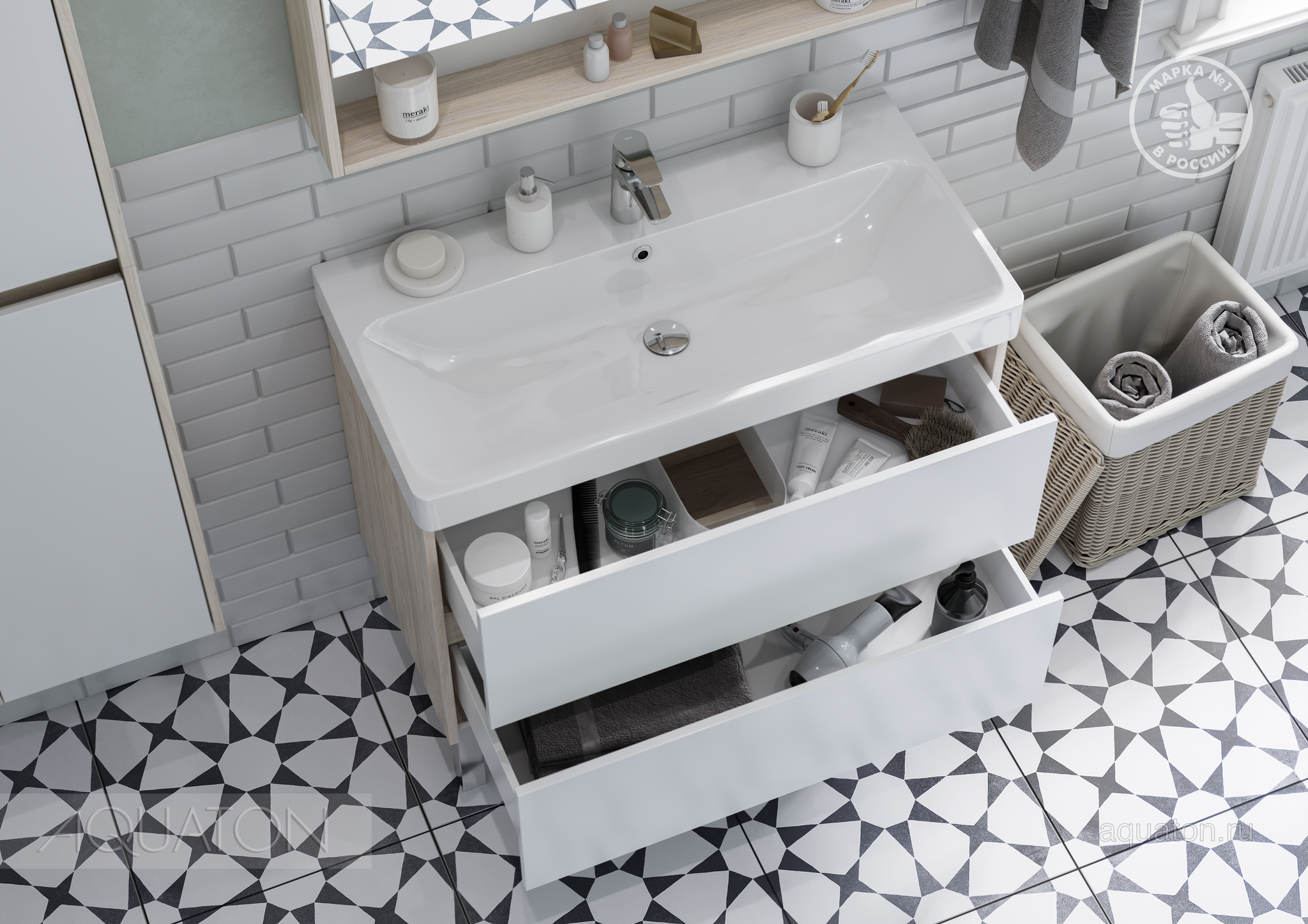 Тумба Сканди 90 выполнена в популярном минималистичном скандинавском стиле. Корпус тумбы выполнен из влагостойкой ЛДСП в декоре натурального дерева, а фасады в белой глянцевой покраске. Конструктивно тумба состоит из 2 вместительных ящиков, установленных на направляющие с интегрированной системой push-to-open для комфортного использования. На тумбе нет выступающих деталей и фурнитуры, открытие ящиков реализовано нажатием на фасад. К тумбе идеально подходит белоснежная раковина Адриана от бренда Santek. Раковина продается отдельно. Тумбу по желанию можно использовать в двух вариантах: как подвесную или дополнительно приобрести опоры.
