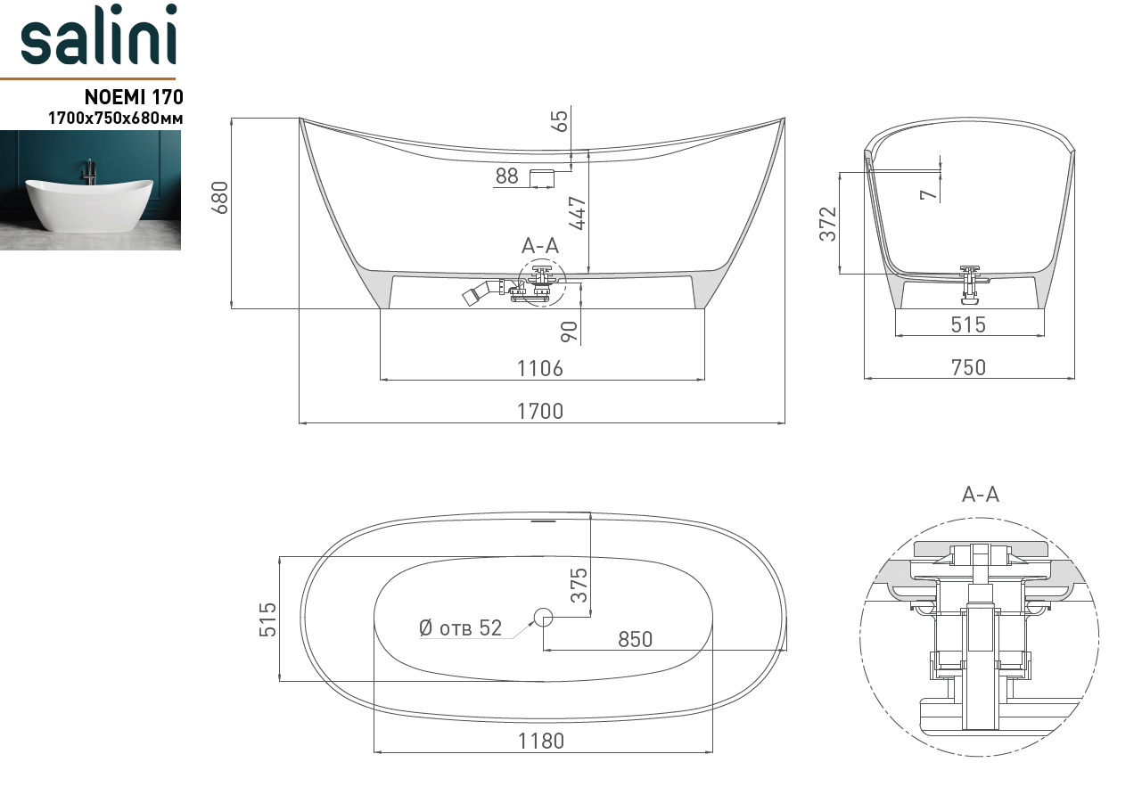 Большая изысканная отдельностоящая ставшая культовой ванна, одна из самых крупных по глубине и внутренней вместимости. В NOEMI можно принимать ванну вдвоём — размер чаши позволяет разместиться в ней с максимальным комфортом. Архитектурное бюро Salini специально разработало дизайн чаши таким образом, чтобы на бортики ванны можно было удобно положить руки. Невероятно удобная внутри — она мгновенно настраивает на расслабление и отдых.
