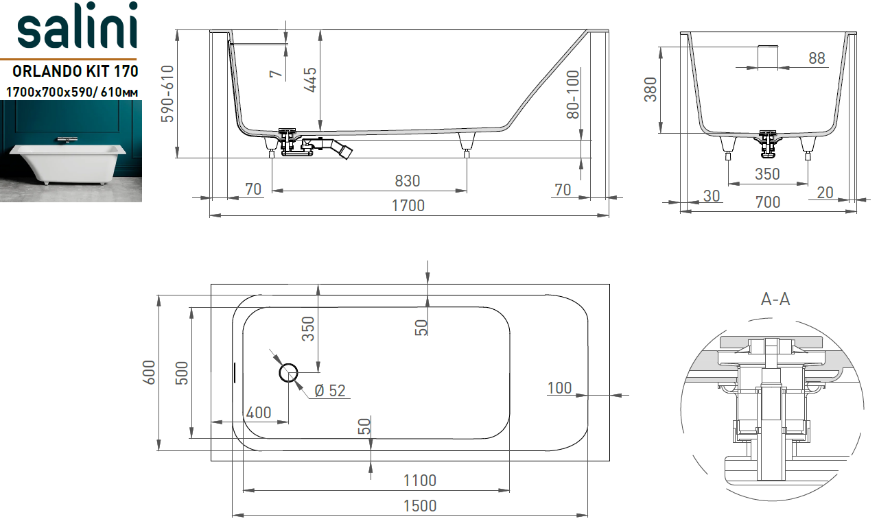 Ванна встраиваемая ORLANDO_KIT 170 матовая S-Stone