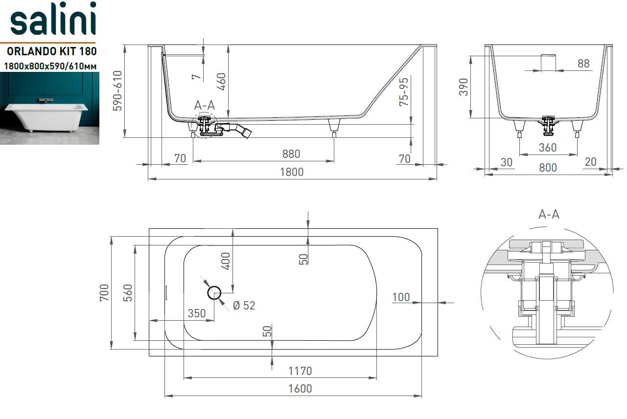 Ванна встраиваемая ORLANDO_KIT 180 матовая S-Sense